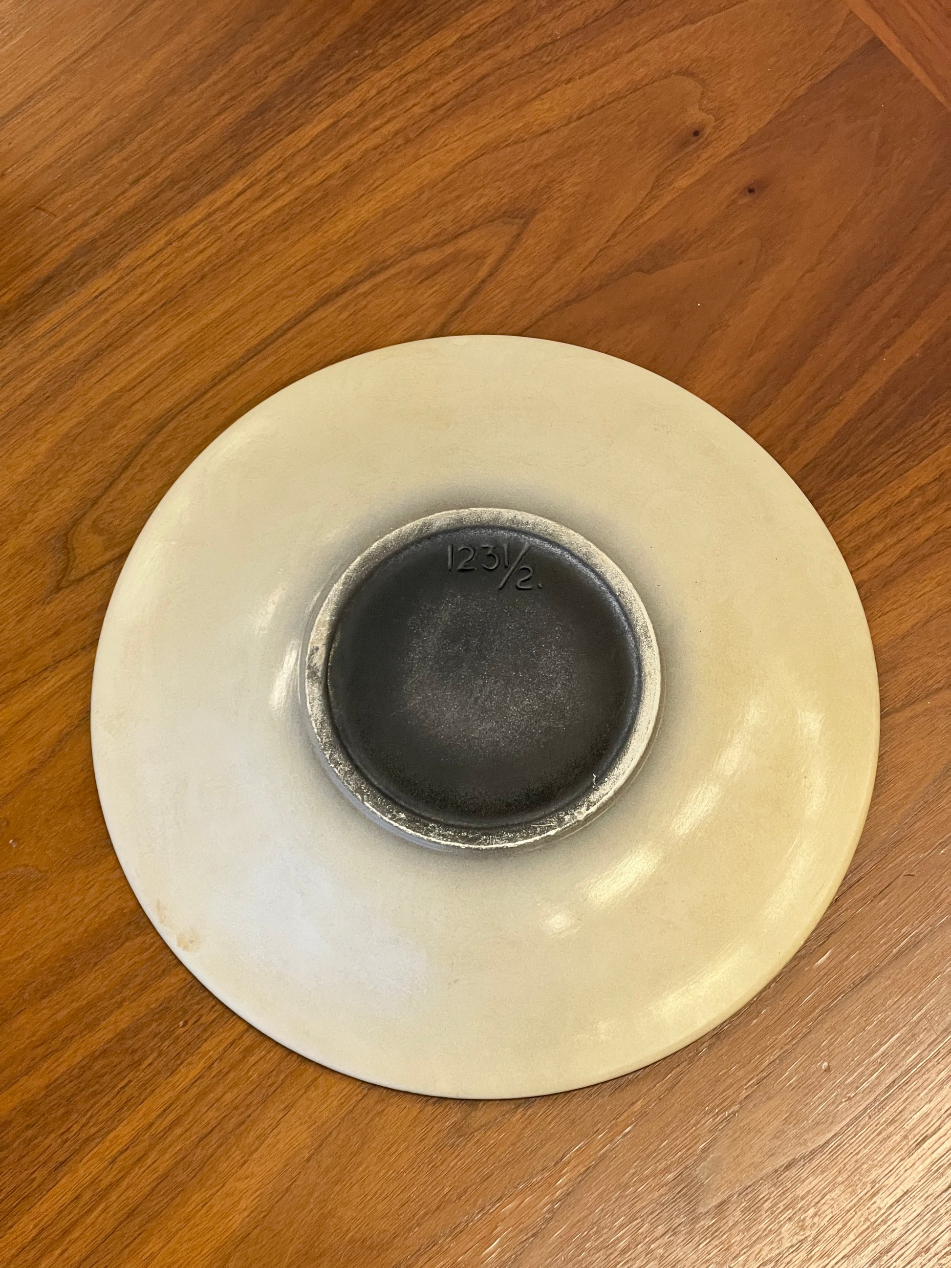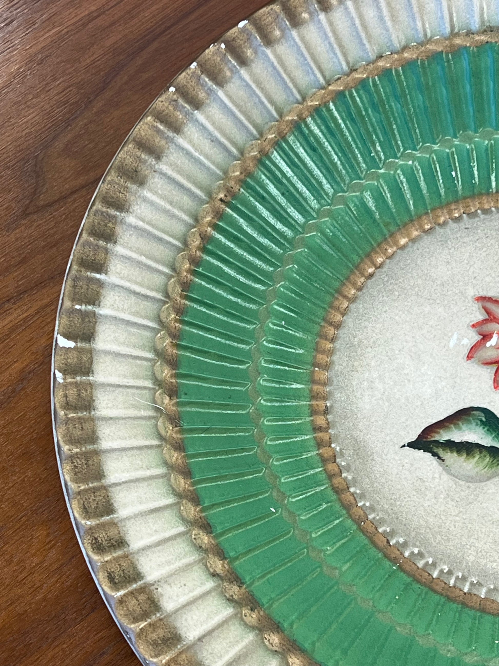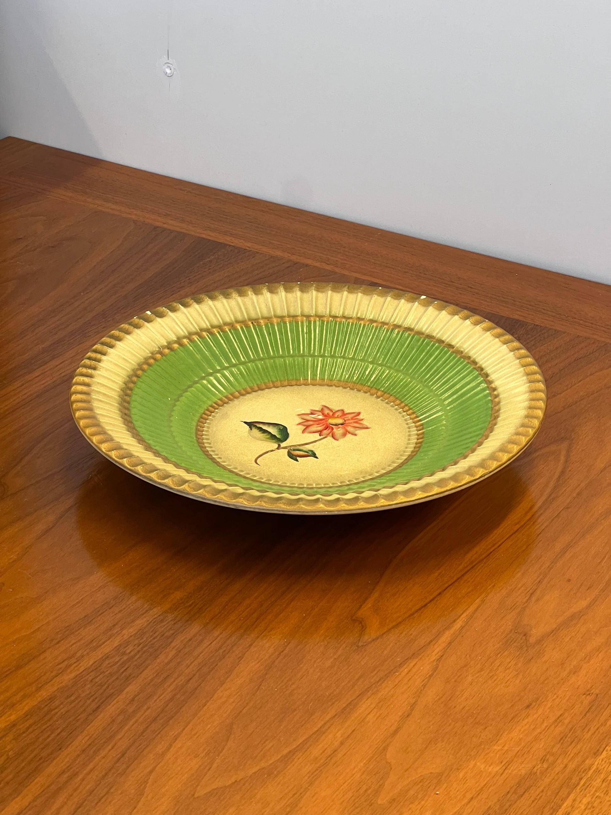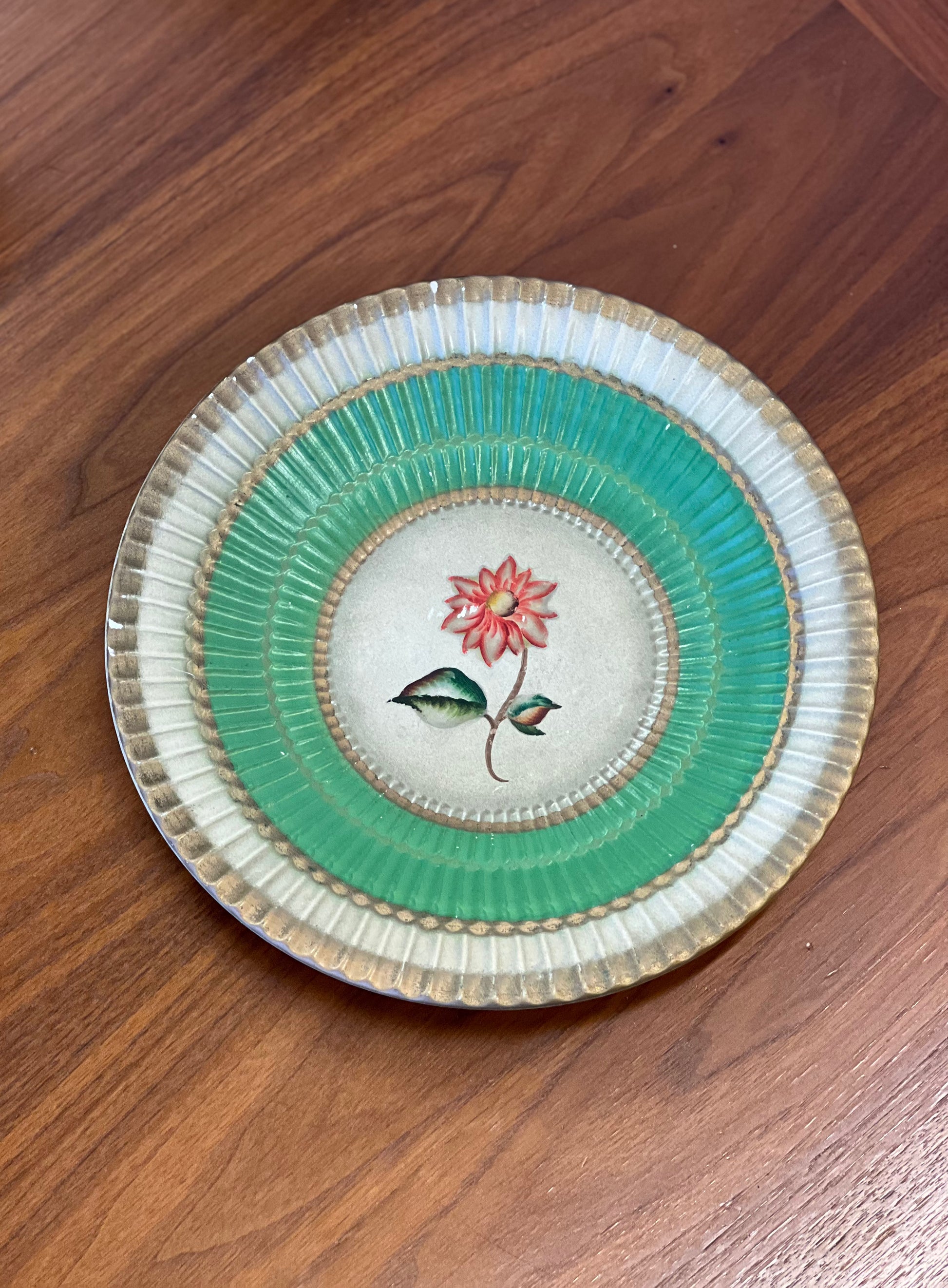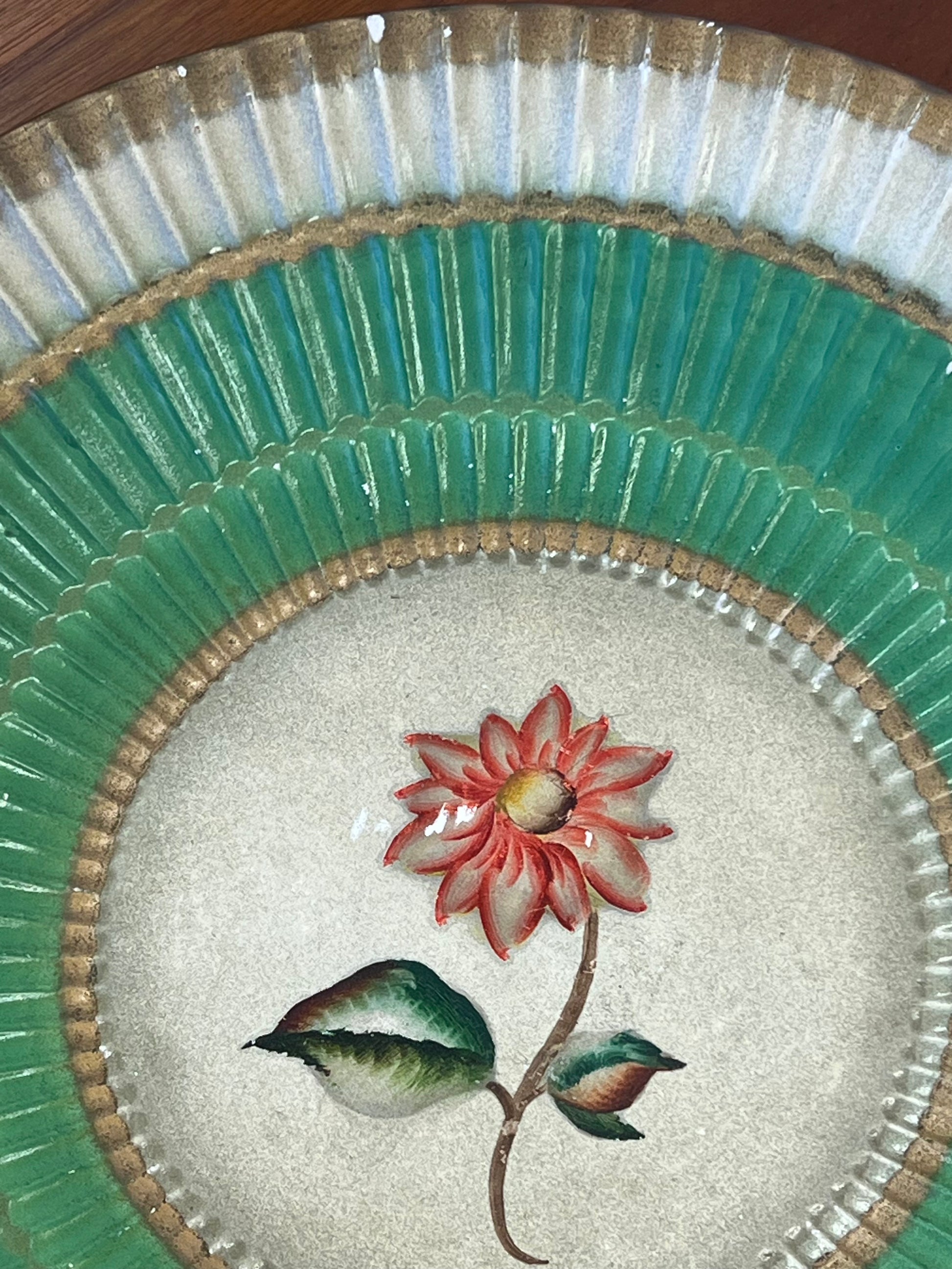 Dekoratyvinė stiklinė lėkštė su gėlės motyvu centre. Žalsvai melsvi ornamentai, reljefinis kraštas ir auksinės spalvos detalės suteikia jai elegantišką, vintažinį stilių. Puikiai tinka interjero dekorui ar kolekcijai, tvarkinga būklė.