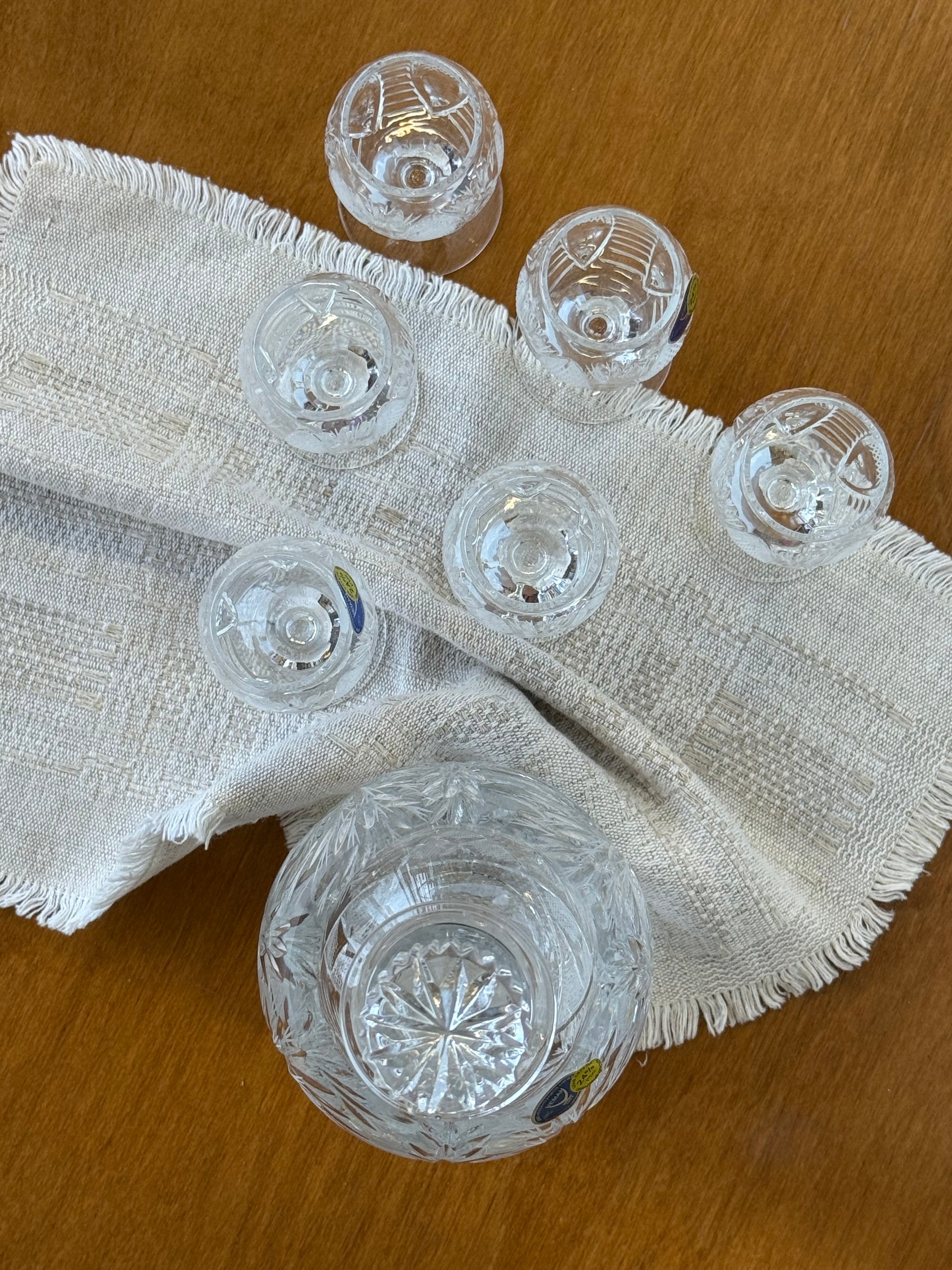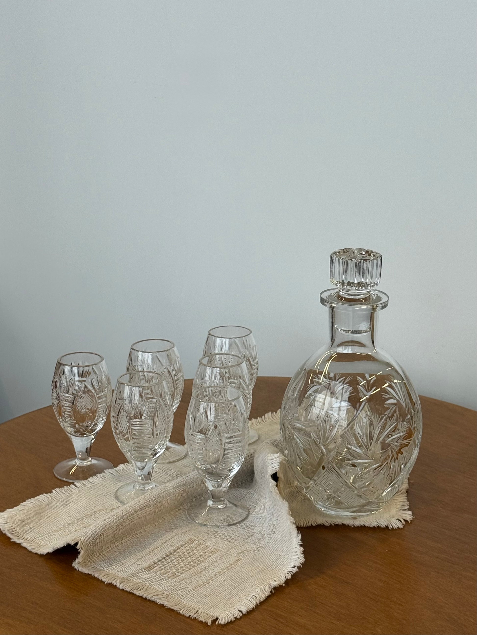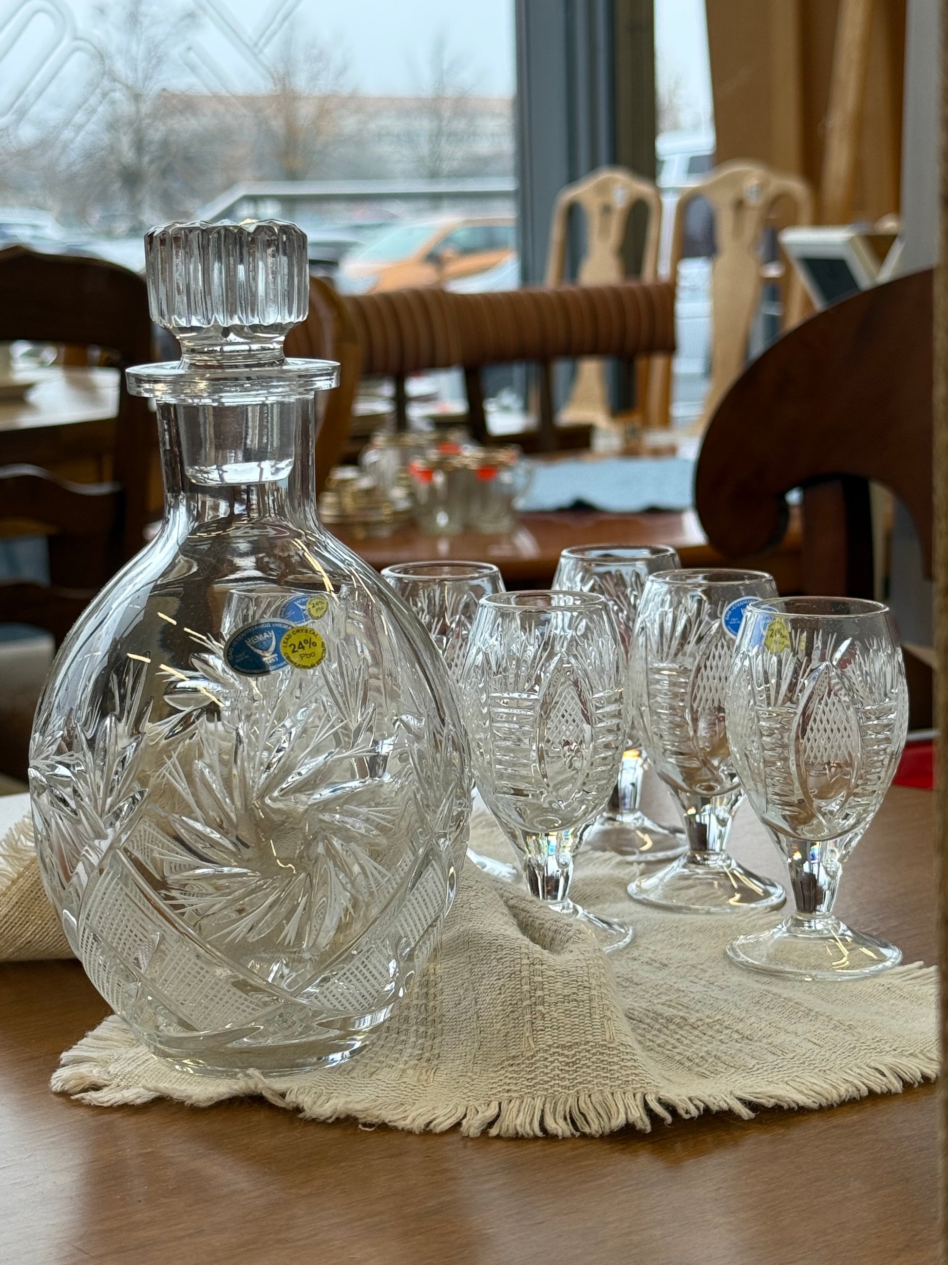 Aukštos kokybės grafinas su taurėmis iš krikštolo. Pagamintas iš 24% švino oksido krištolo, garsėjančio ypatingu skaidrumu, svoriu ir ryškiu šviesos lūžiu. Rankinio šlifavimo raštai suteikia rinkiniui prabangos ir išskirtinumo. Puikus pasirinkimas interjerui, dovanai ar kolekcijai. Originalūs gamintojo lipdukai garantuoja tikrumą bei kokybę. Baltarusijos krištolo gamykla (Neman Crystal Factory). Pagaminimo metai 1980–1995 m.