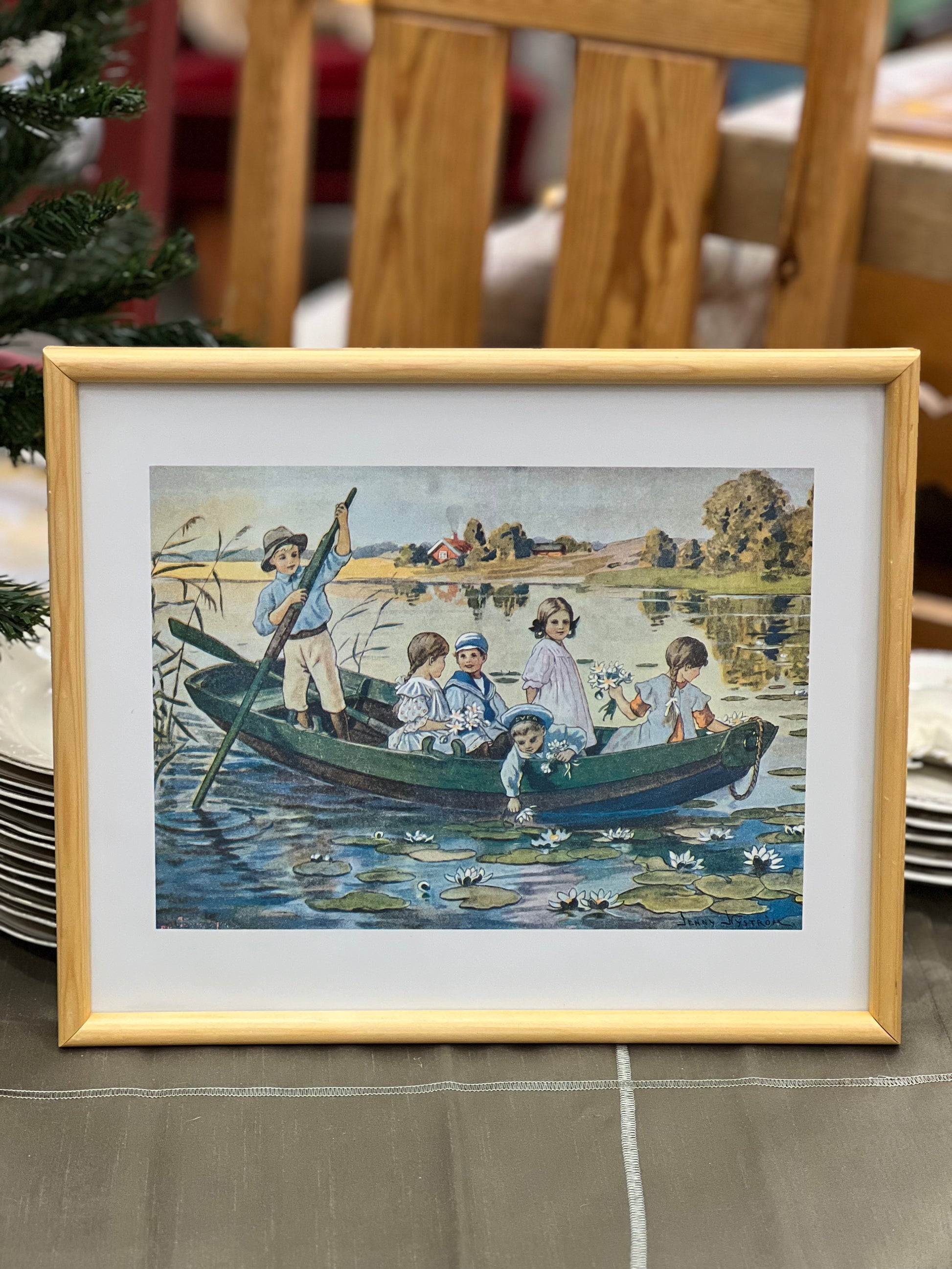 Mielas Jenny Nyström paveikslas - vaikai irkluojantys valtimi, skinantys vandens lelijas.