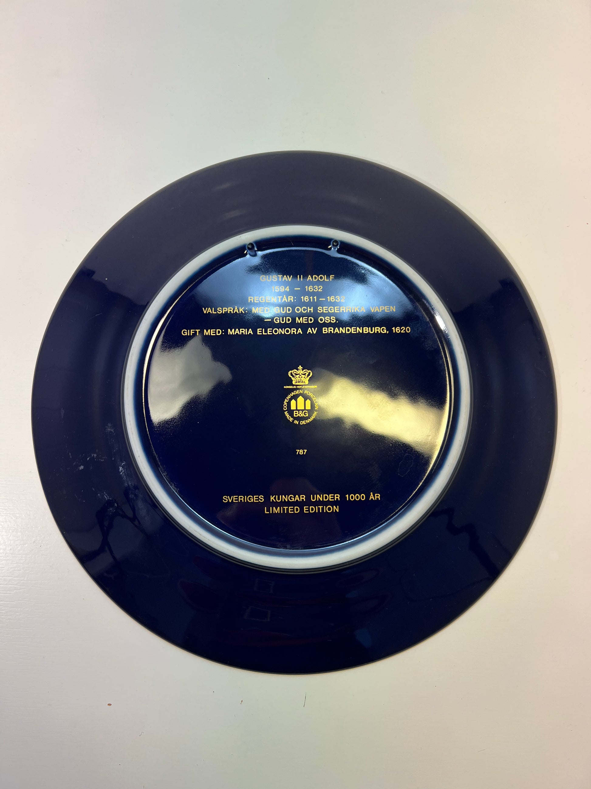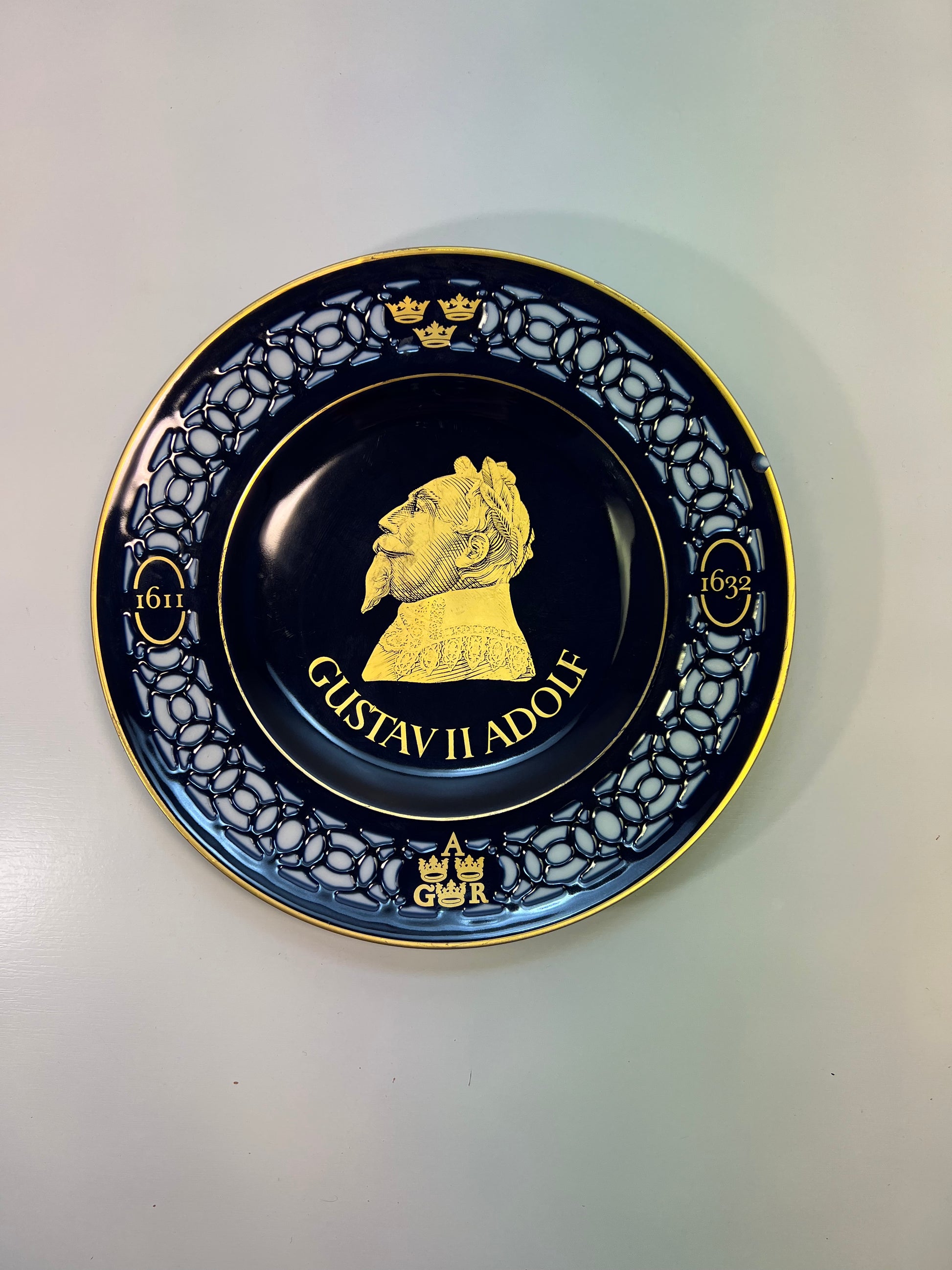 Ši lėkštė skirta vienam žymiausių Švedijos valdovų – Gustavui II Adolfui. Tai yra išskirtinė kolekcinių lėkščių serijos „Sveriges Kungar under 1000 år“ (Švedijos karaliai per 1000 metų) dalis, pagaminta garsioje Danijos porceliano manufaktūroje Bing & Grøndahl. Kobalto mėlynumo fonas su 24 karatų aukso dekoracijomis. Ažūriniai kraštai suteikia lėkštei prabangos ir lengvumo pojūtį.