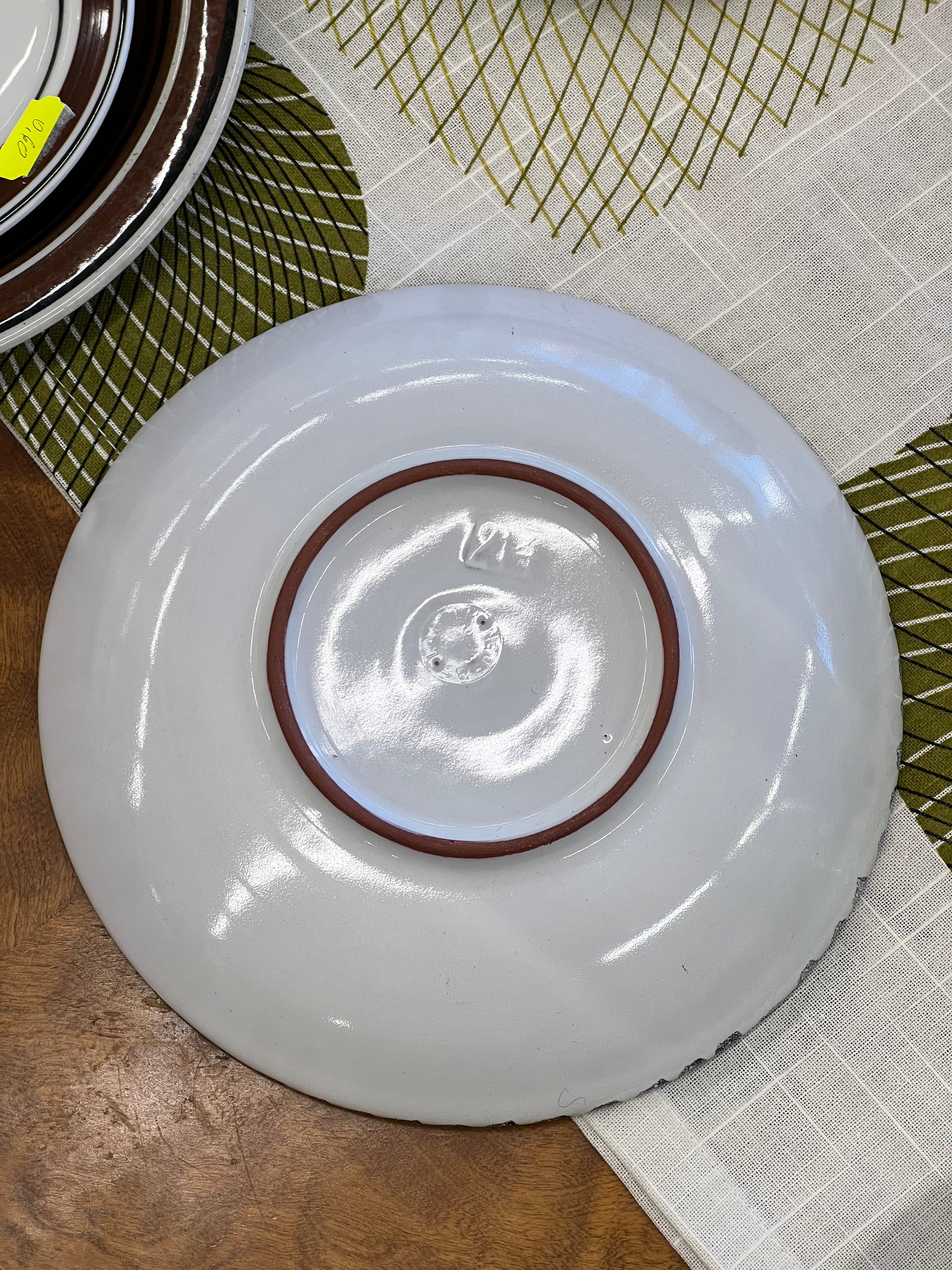 Žalsvai rudos spalvų paletės ir lapeliais puoštas lėkštės kraštas, sukuria šilumos ir gamtos artumo pojūtį.