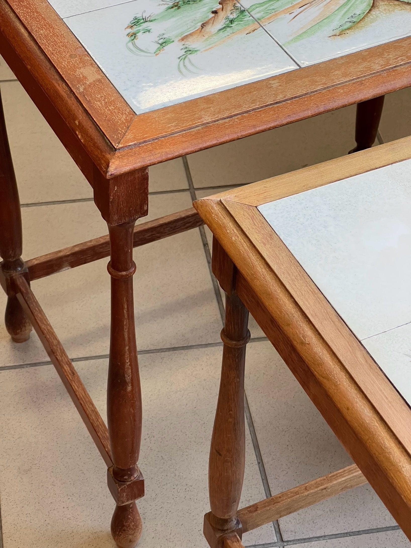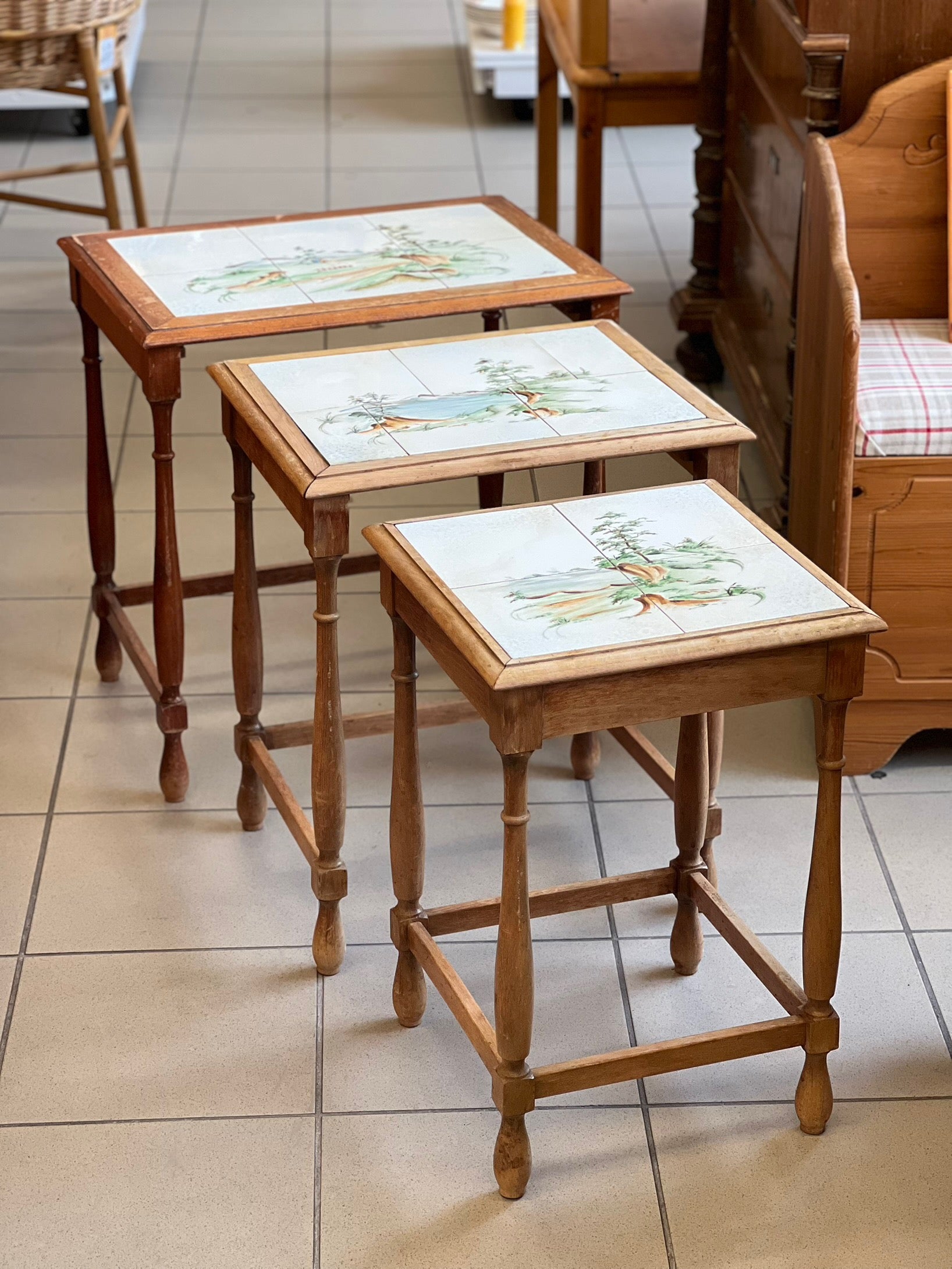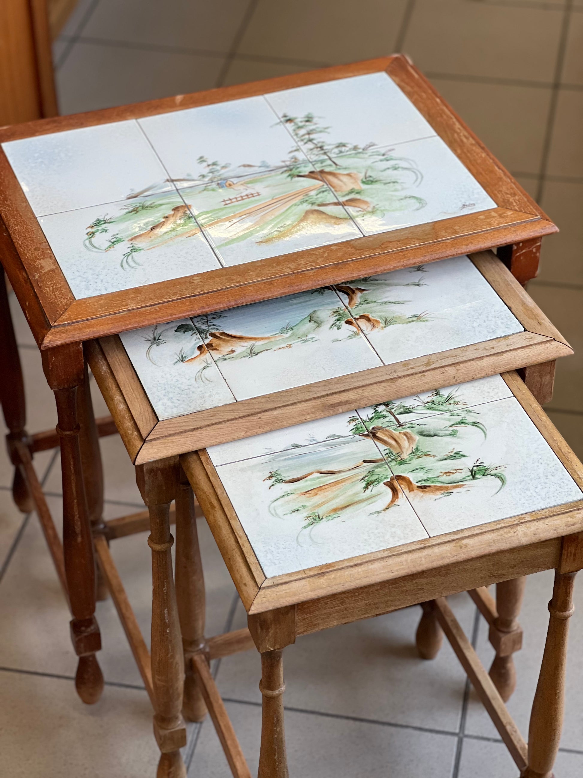 Trijų staliukų komplektas. Skirtingo dydžio, susistumia vienas po kitu. Stalviršiai dekoruoti keramikinėmis plytelėmis su rankų darbo peizažu. Rėmai pagaminti iš natūralaus medžio, kojos – tekintos. Gali būti naudojami kaip dekoratyviniai arba kaip funkciniai kavos/arbatos staliukai. Taip pat gali būti naudojami kaip šoniniai baldai svetainėje ar prieškambaryje.