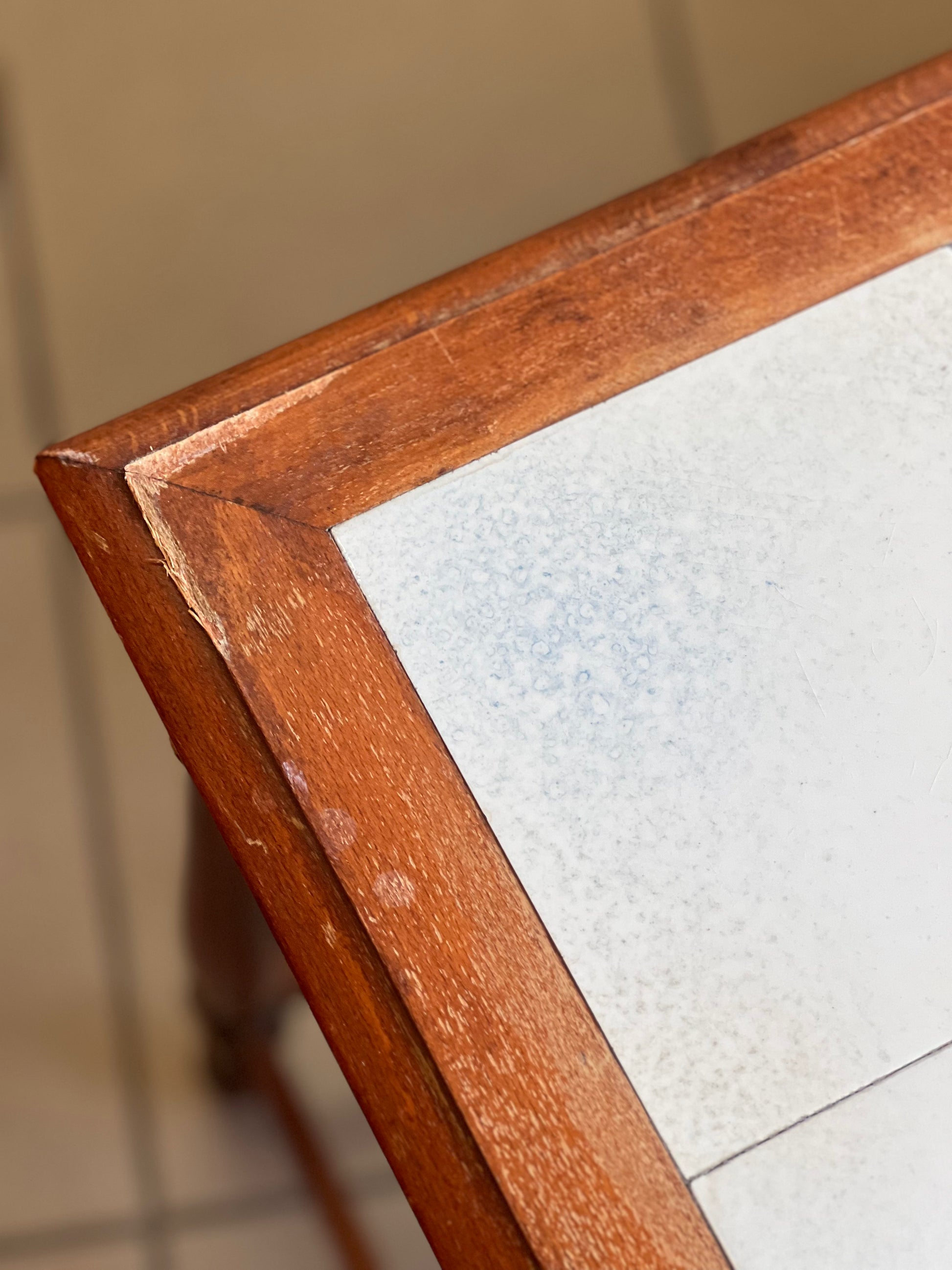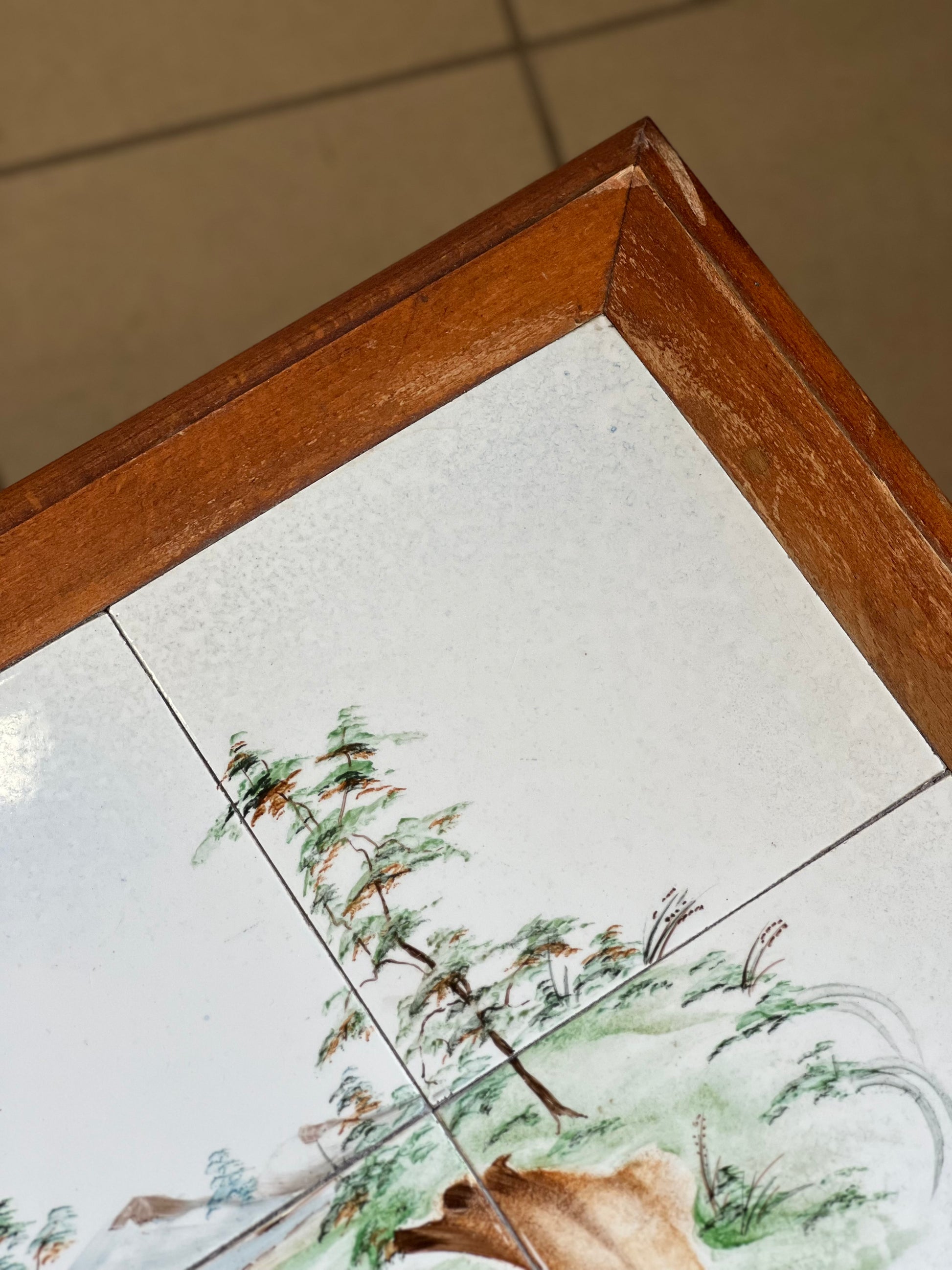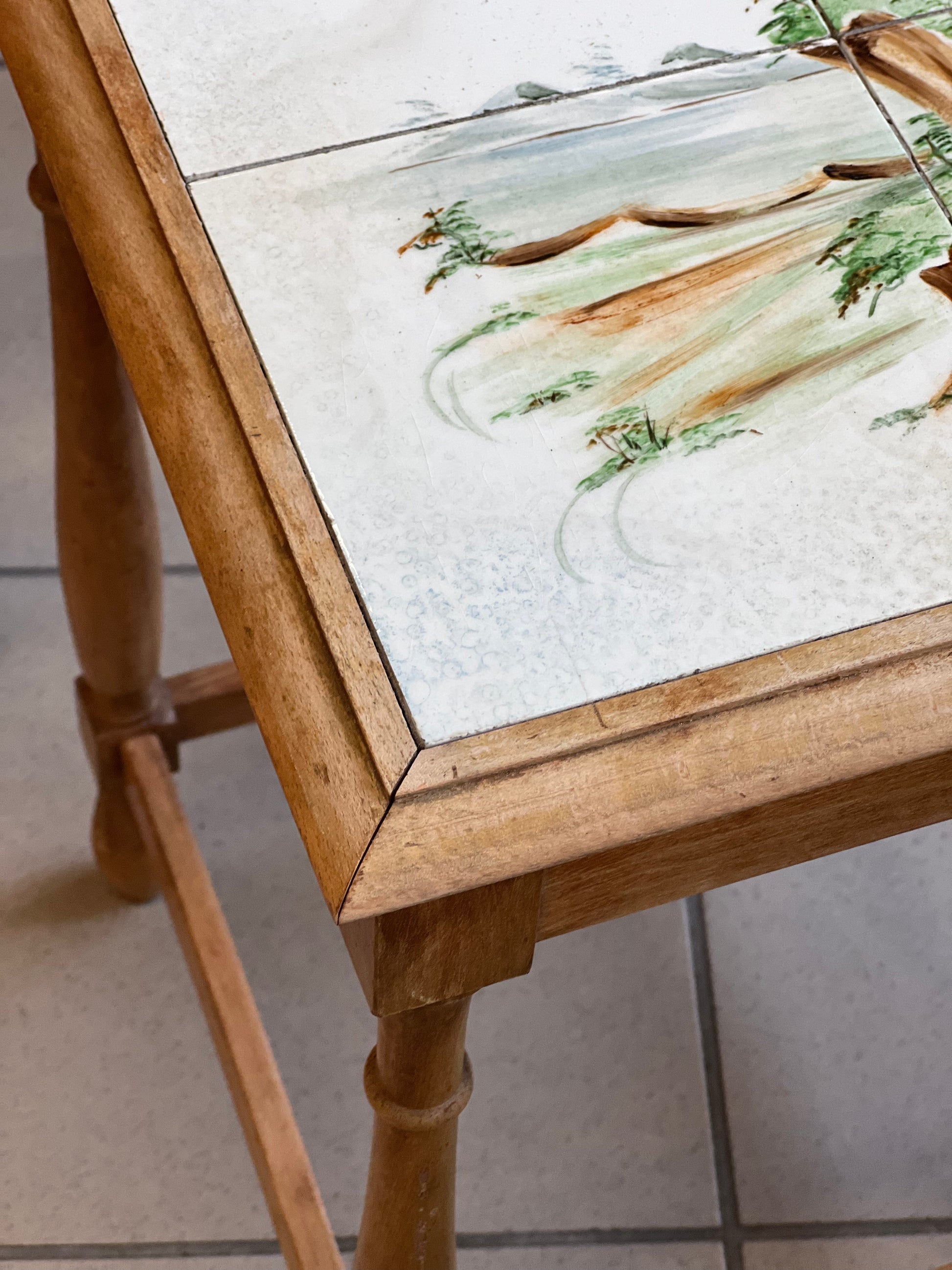 Trijų staliukų komplektas. Skirtingo dydžio, susistumia vienas po kitu. Stalviršiai dekoruoti keramikinėmis plytelėmis su rankų darbo peizažu. Rėmai pagaminti iš natūralaus medžio, kojos – tekintos. Gali būti naudojami kaip dekoratyviniai arba kaip funkciniai kavos/arbatos staliukai. Taip pat gali būti naudojami kaip šoniniai baldai svetainėje ar prieškambaryje.