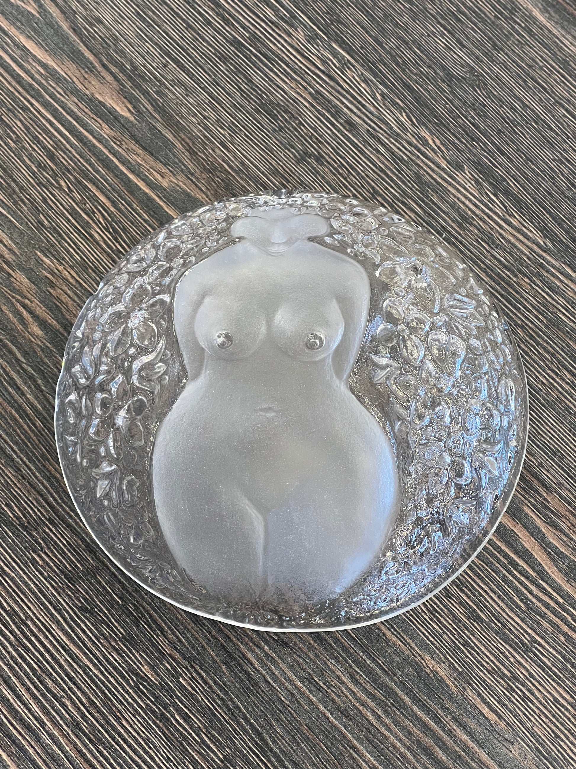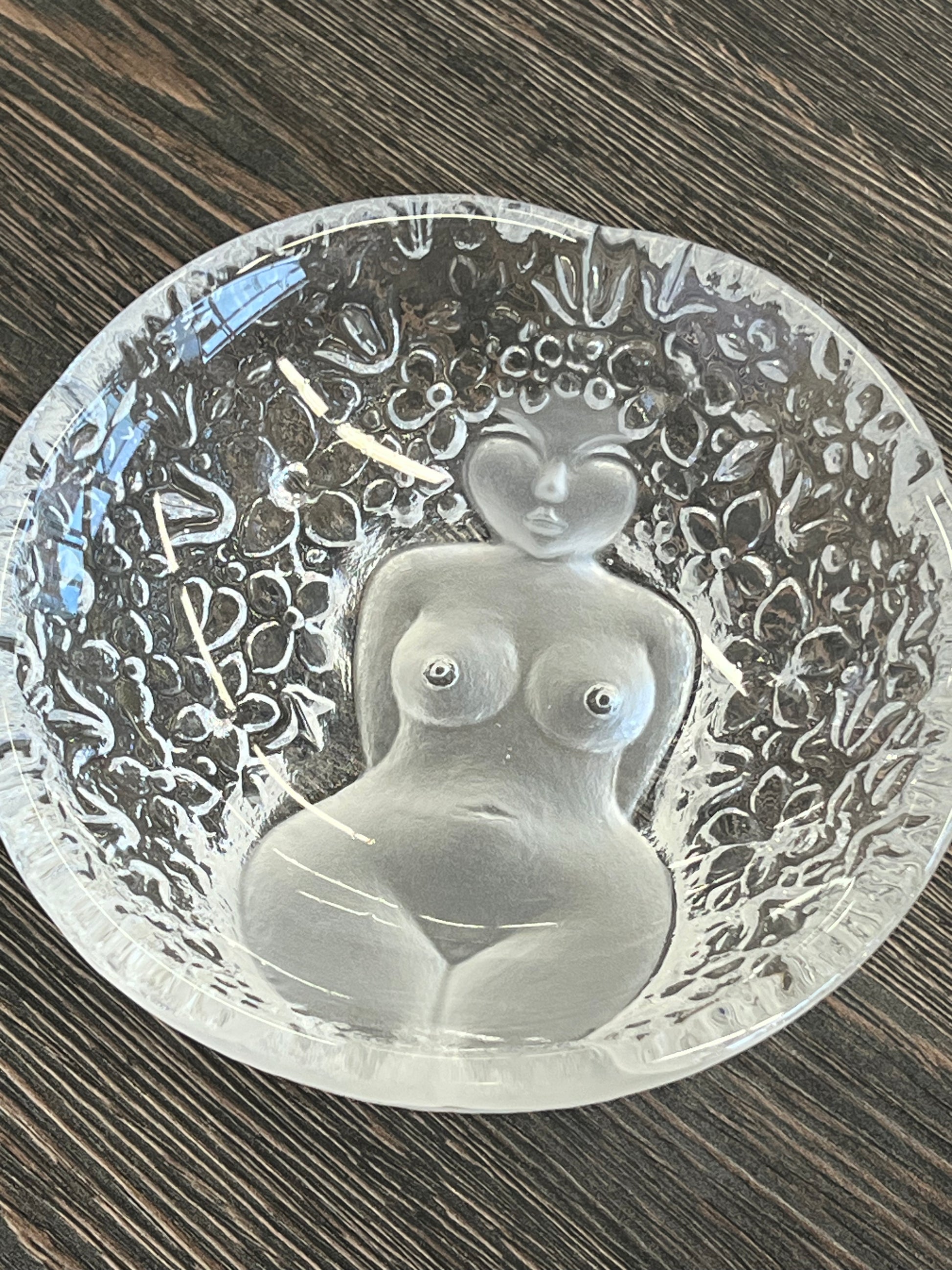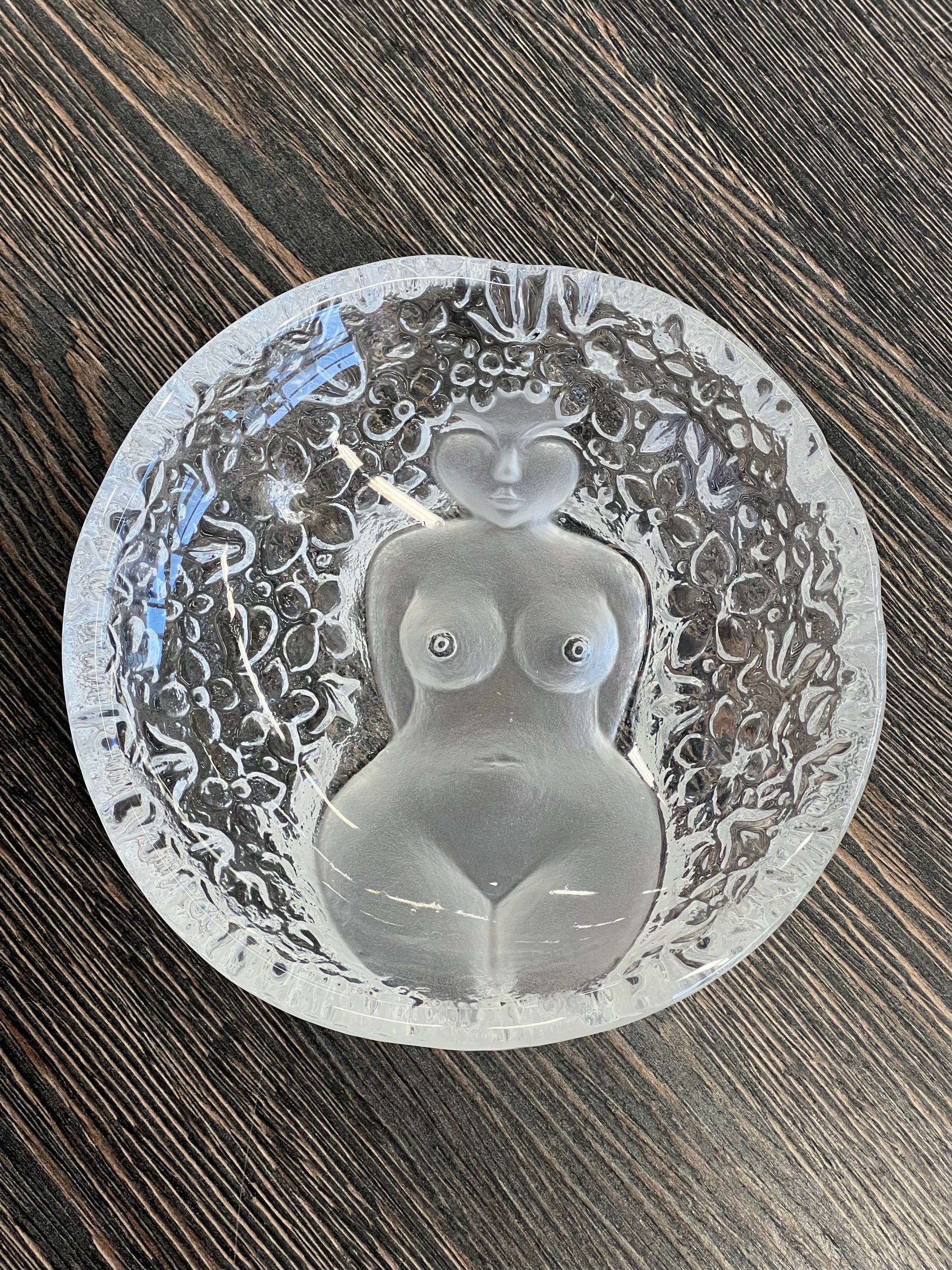 Stiklinis dekoratyvinis dubuo su moters figūra.