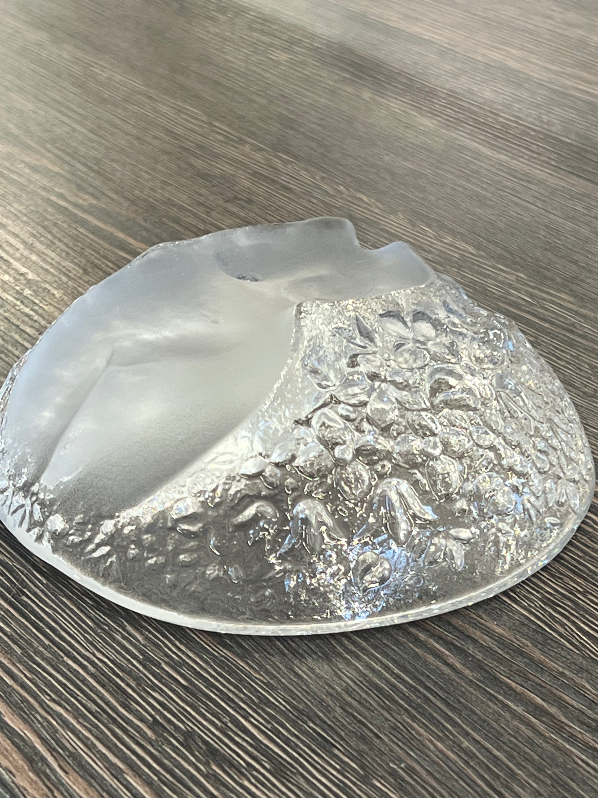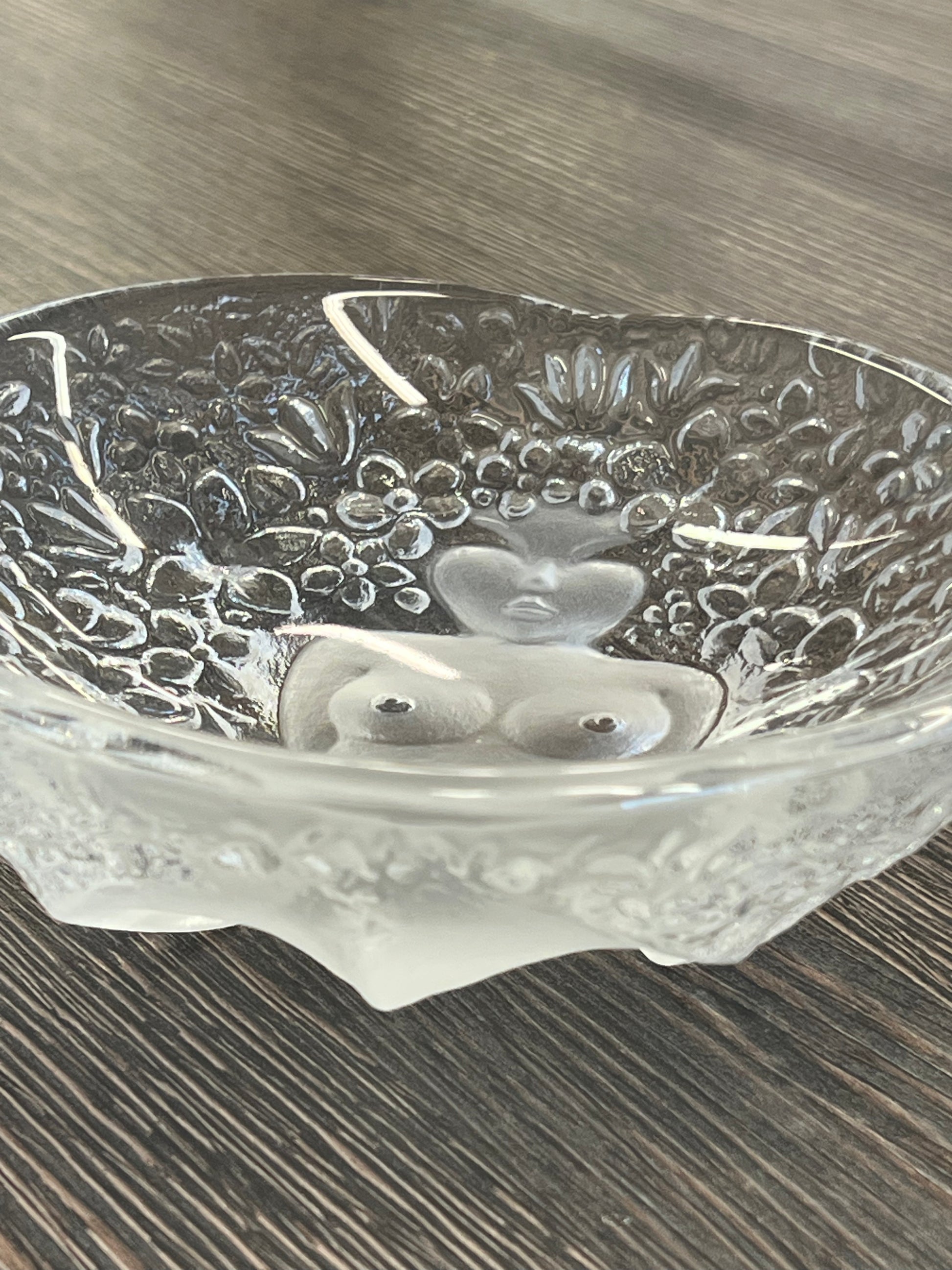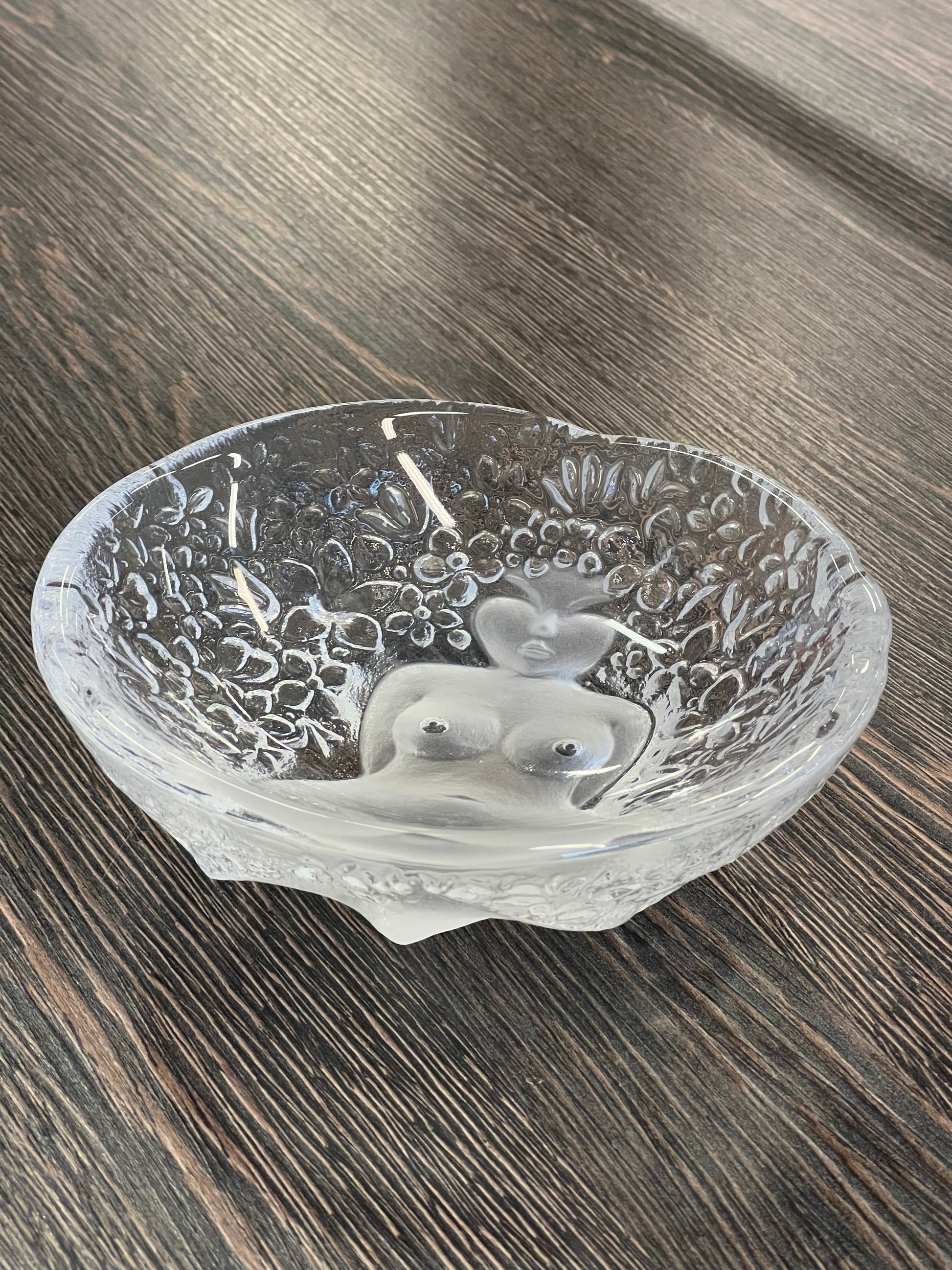 Stiklinis dekoratyvinis dubuo su moters figūra.