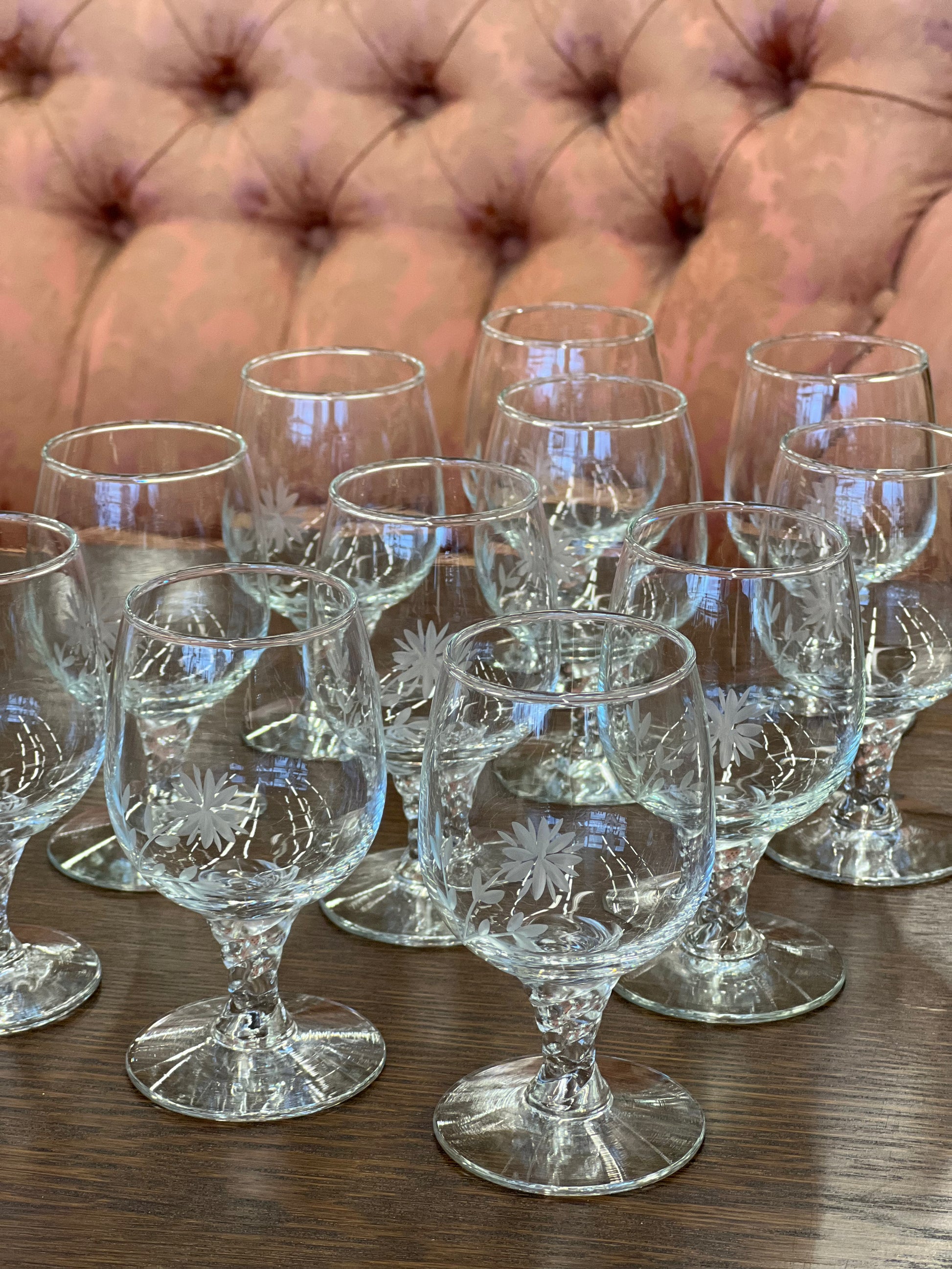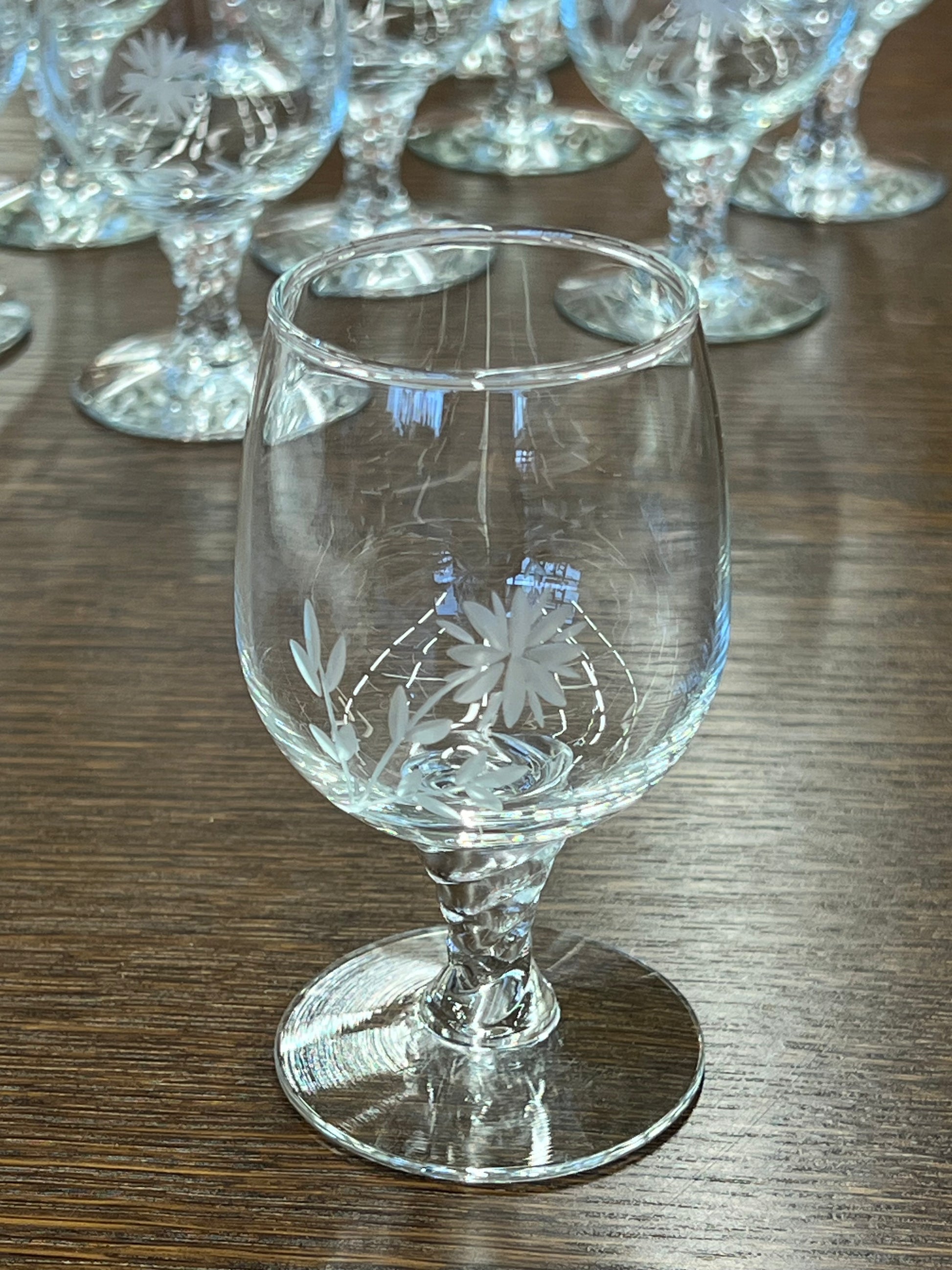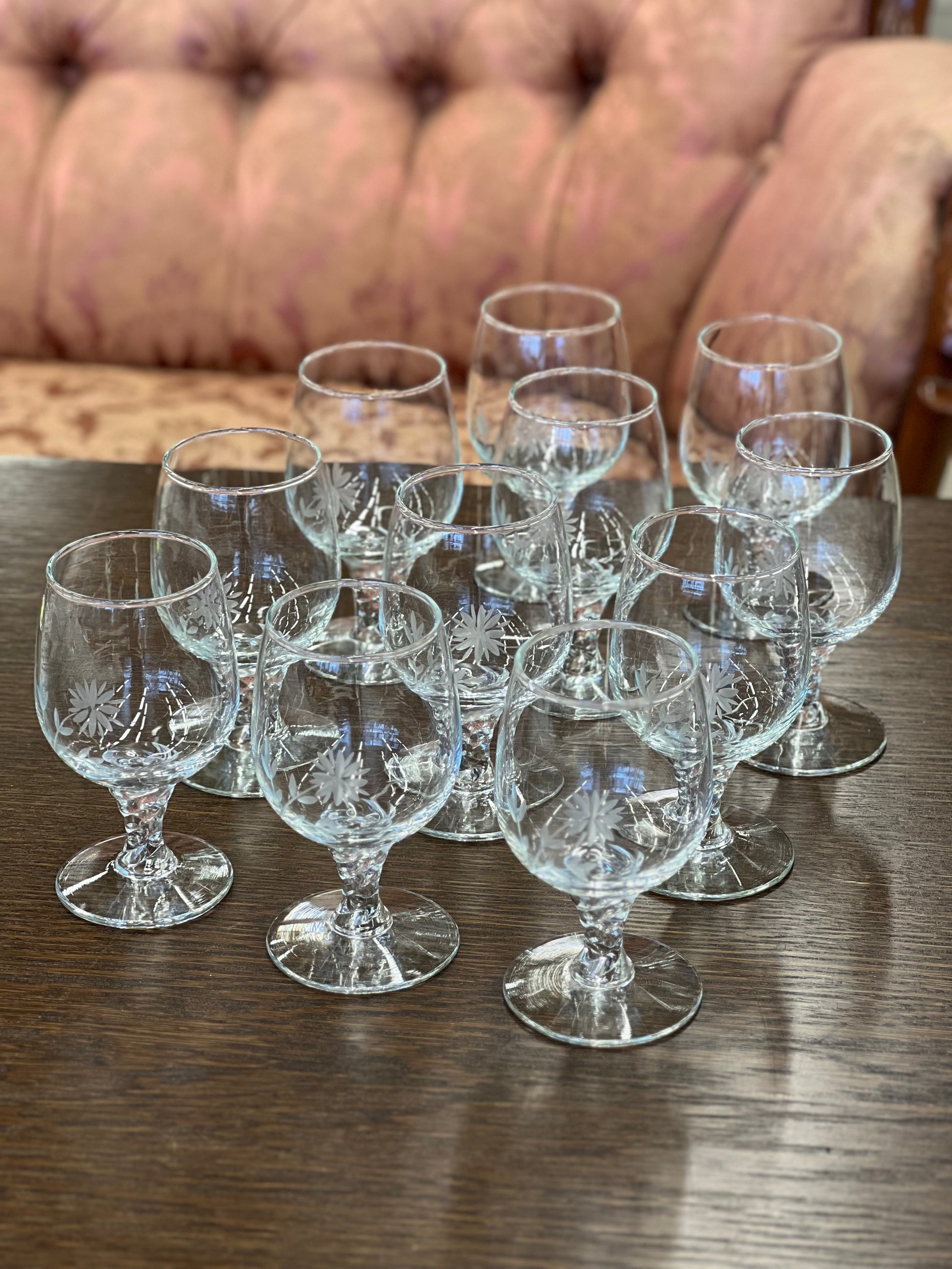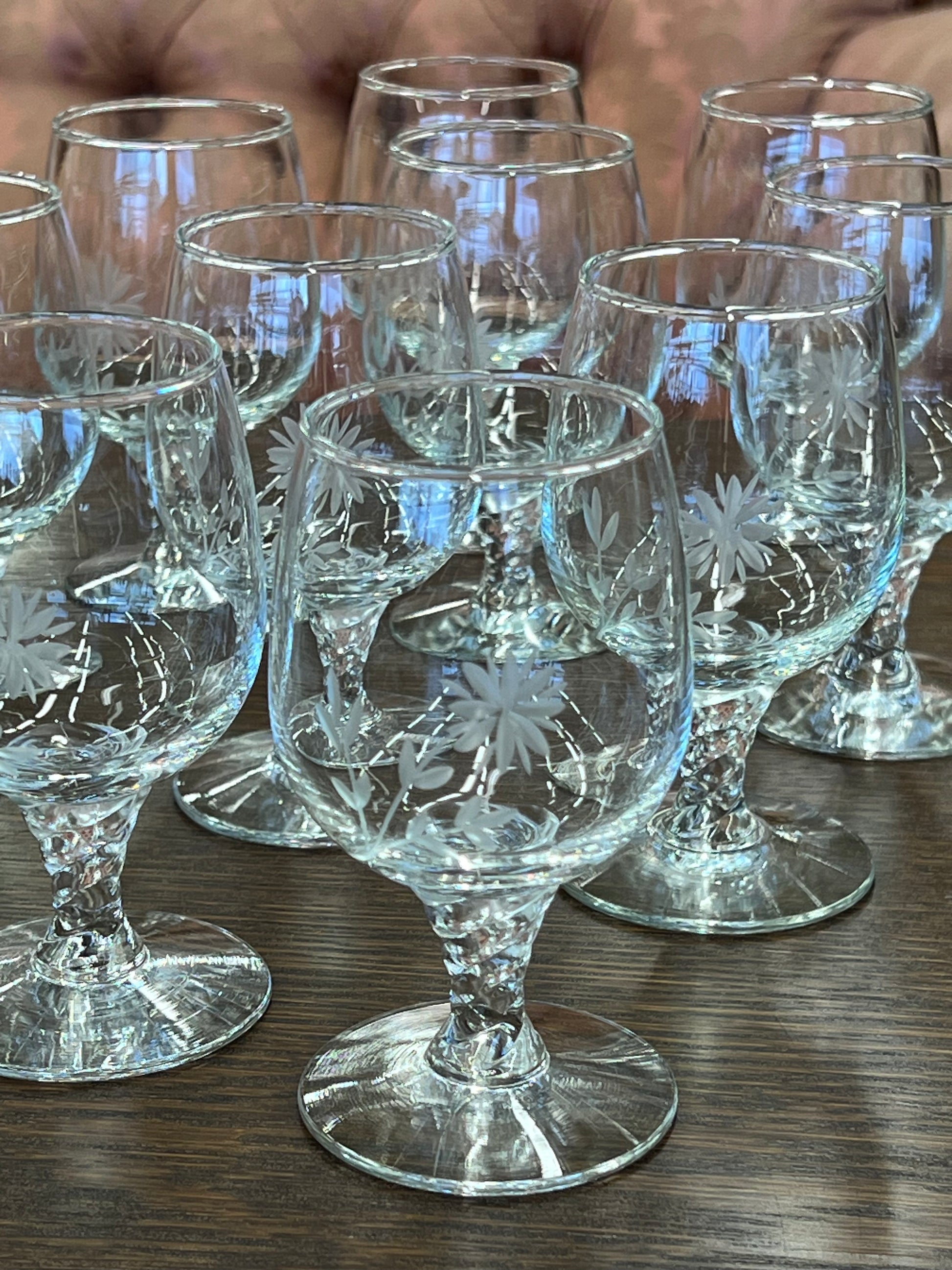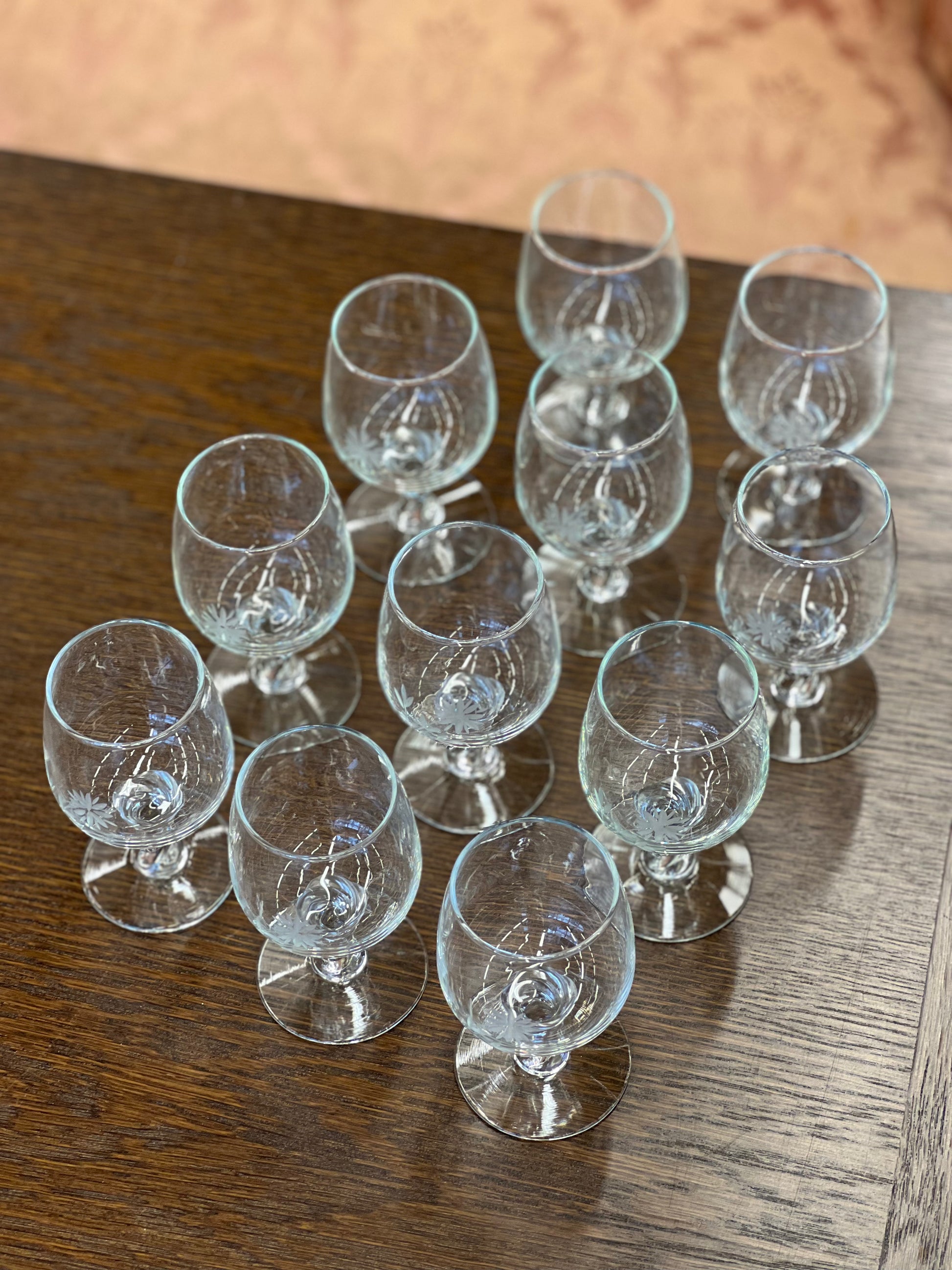 Stikliukų rinkinys iš 11-os vintažinių krištolo taurelių su subtiliai graviruotais gėlių raštais. Elegantiškas pasirinkimas šventėms ar klasikiniam interjerui. Puikiai tinka dovanai ar kolekcijai.