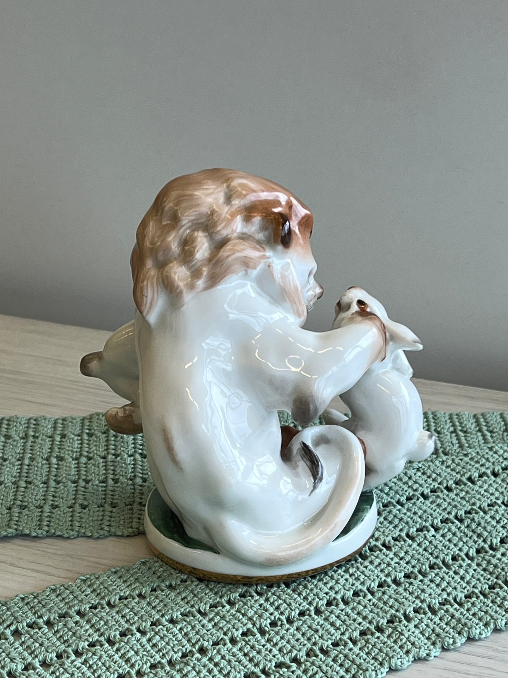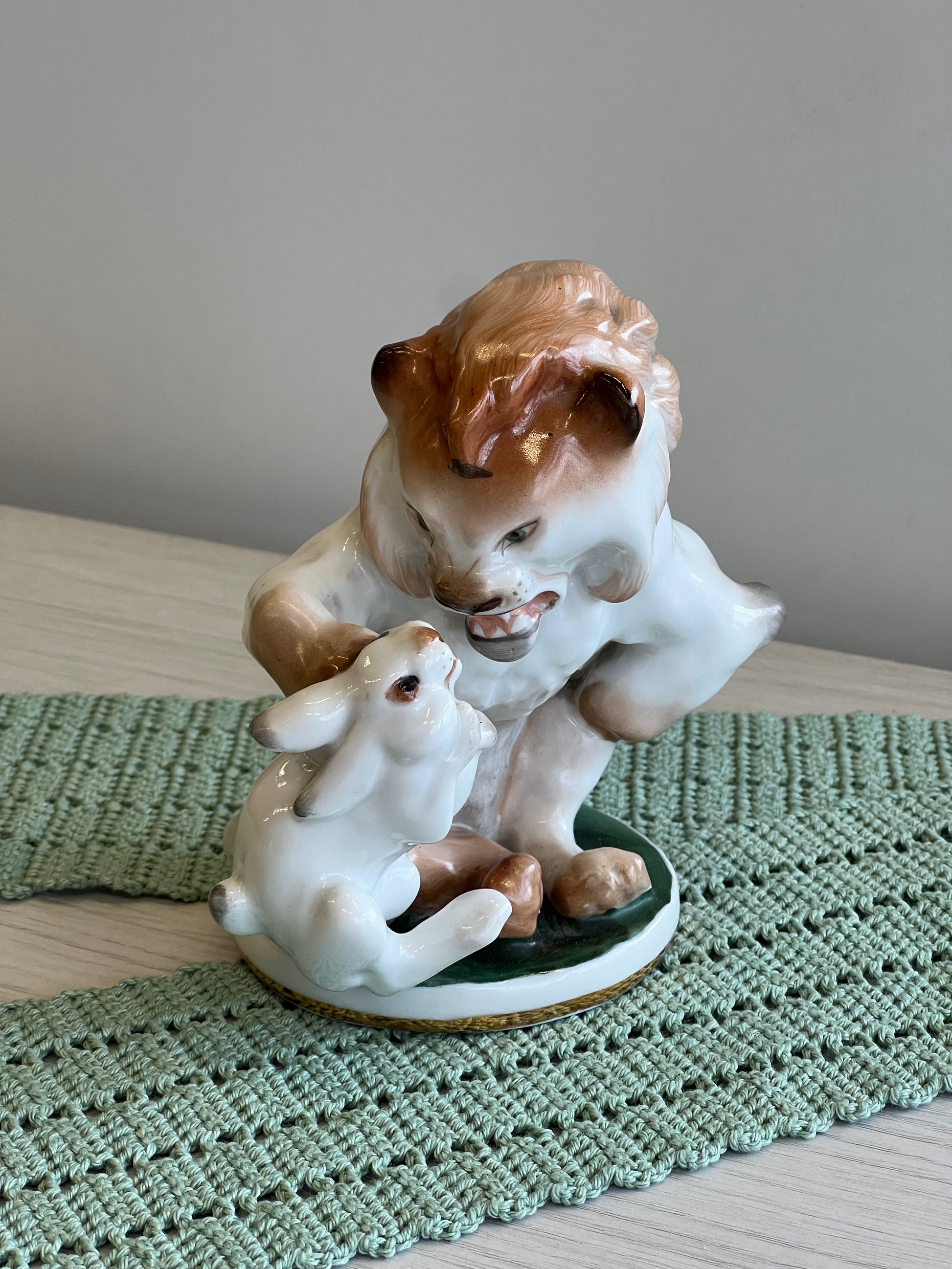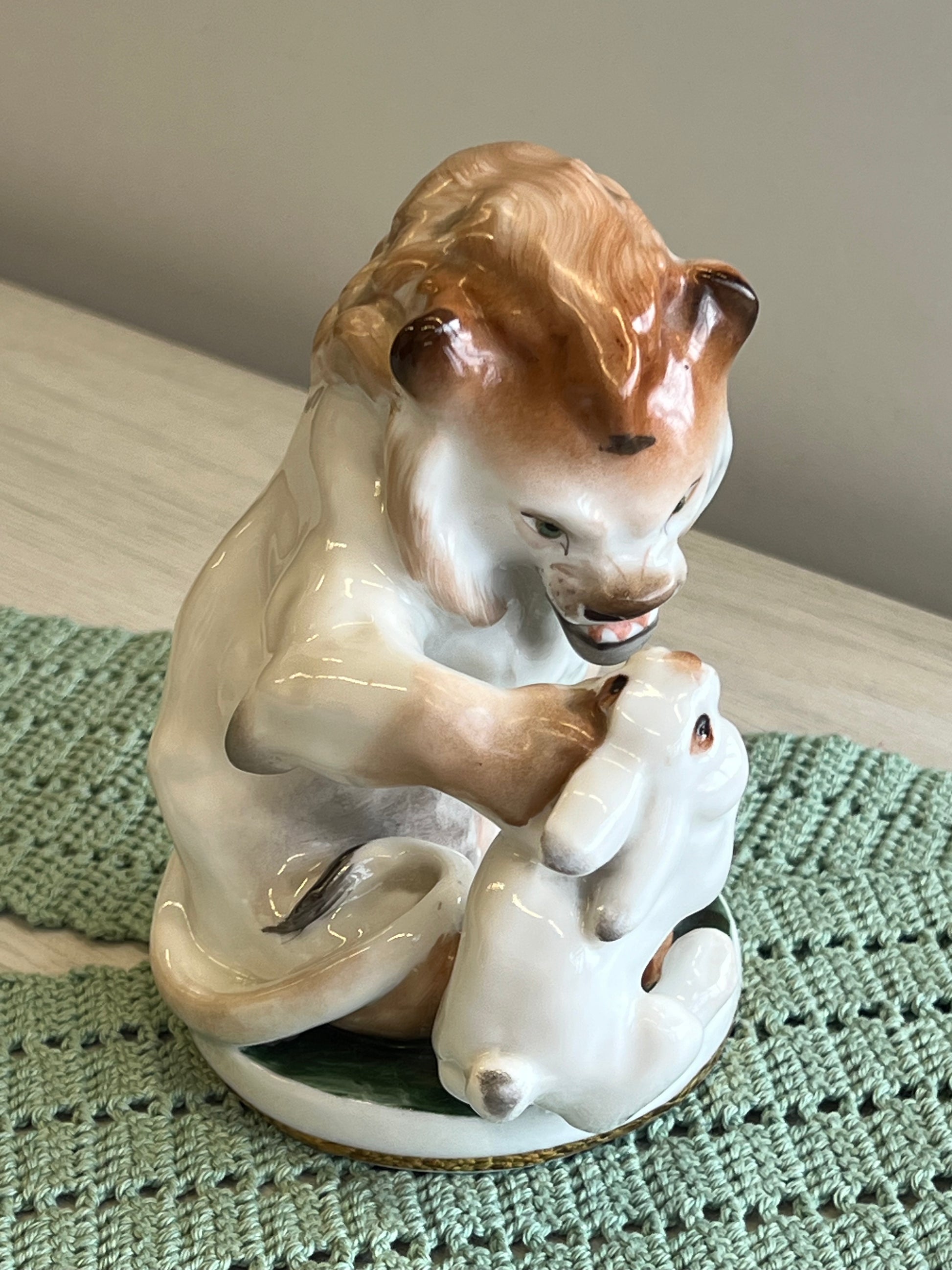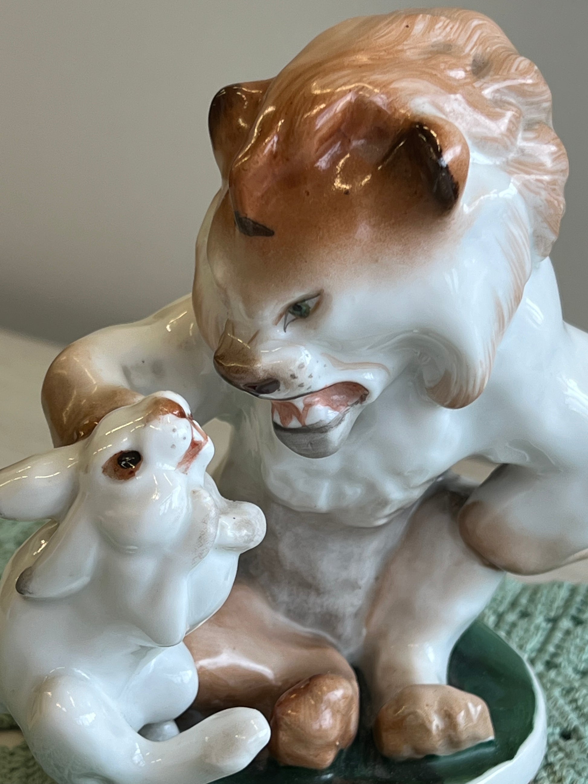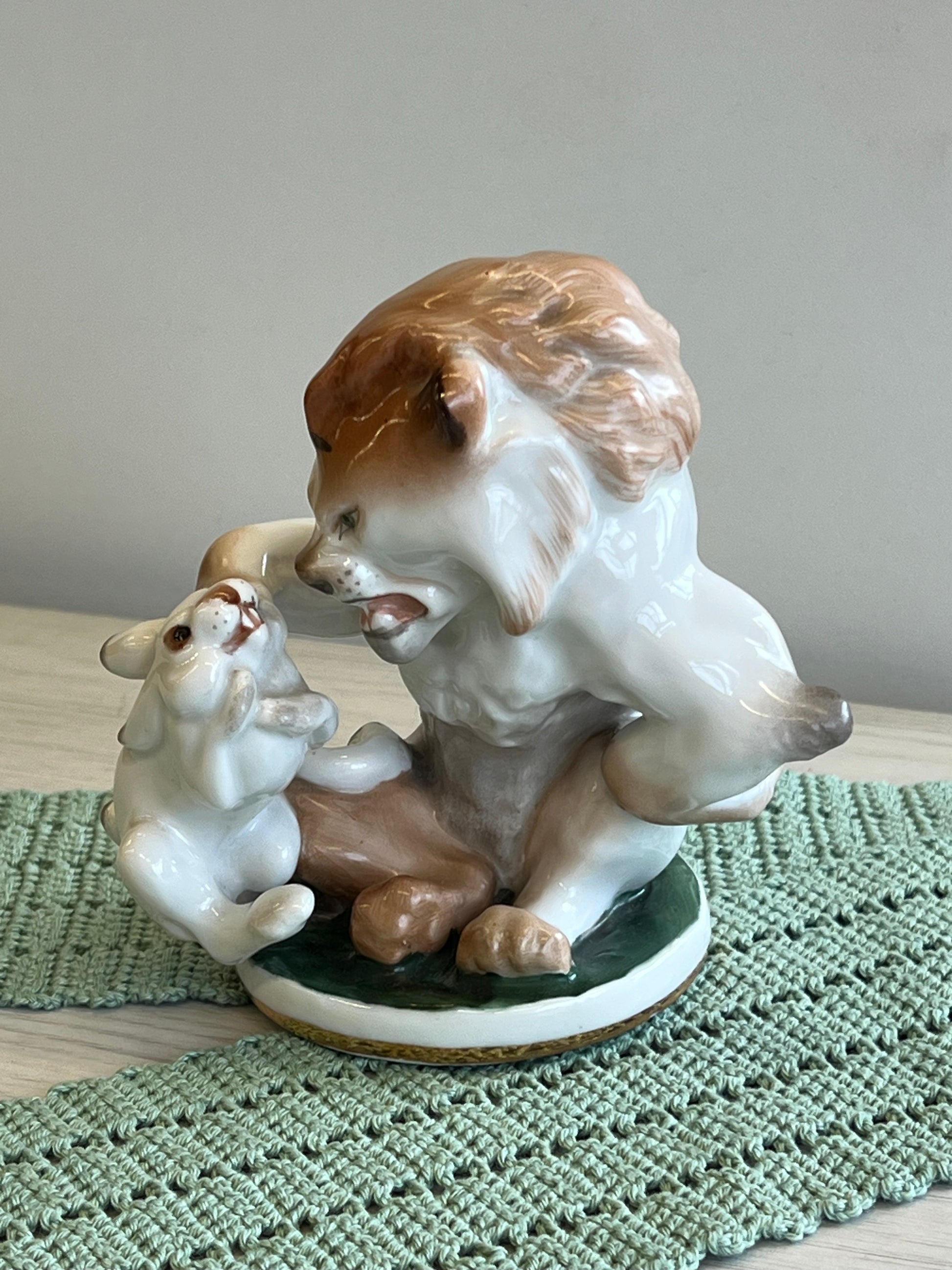Porceliano liūto ir zuikio suvenyras iš SSRS laikotarpio – kolekcinė figūrėlė, rankų darbas. Vertinama kolekcininkų dėl istorinės kilmės ir išskirtinės meistrystės. Lomonosovo porceliano gamykla buvo didžiausia ir garsiausia. Meninė keramika, išsiskirianti rankų tapyba, švelniomis linijomis ir aukšta porceliano kokybe. Statulėlė priklauso vienai iš žinomiausių Lomonosovo gyvūnų serijų. Ženklinimas „ЛФЗ".