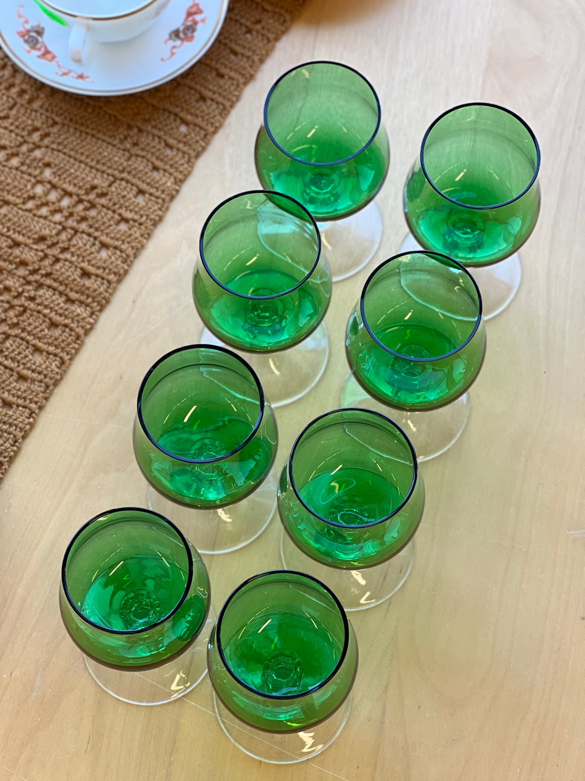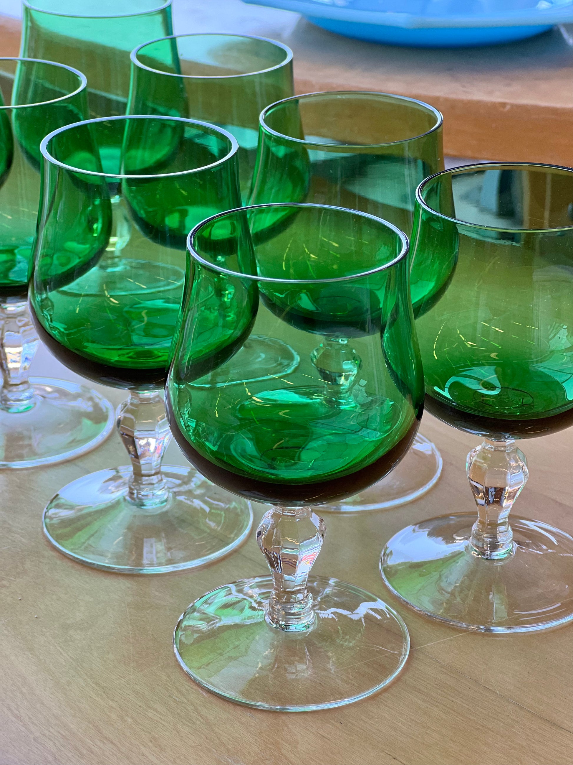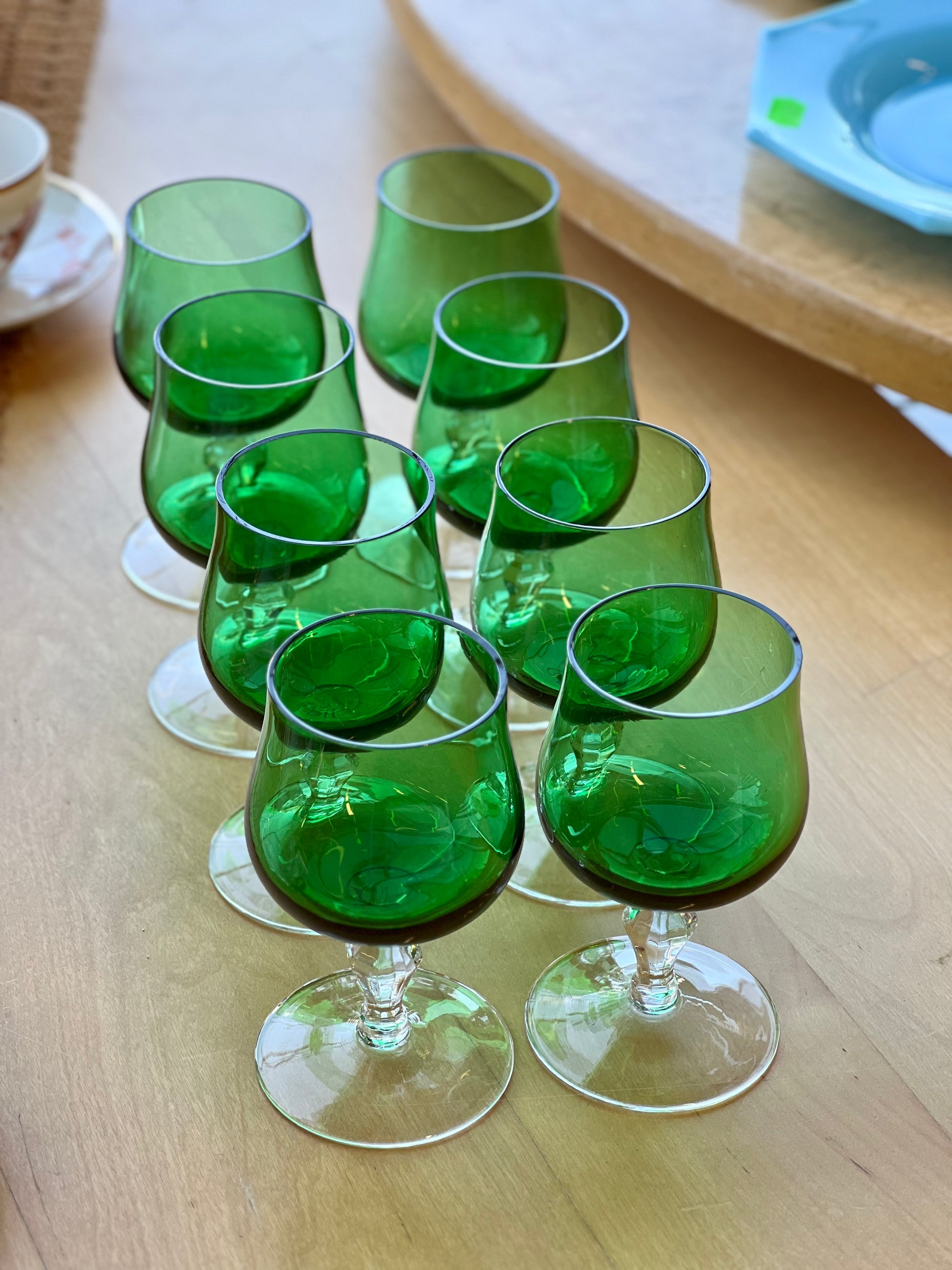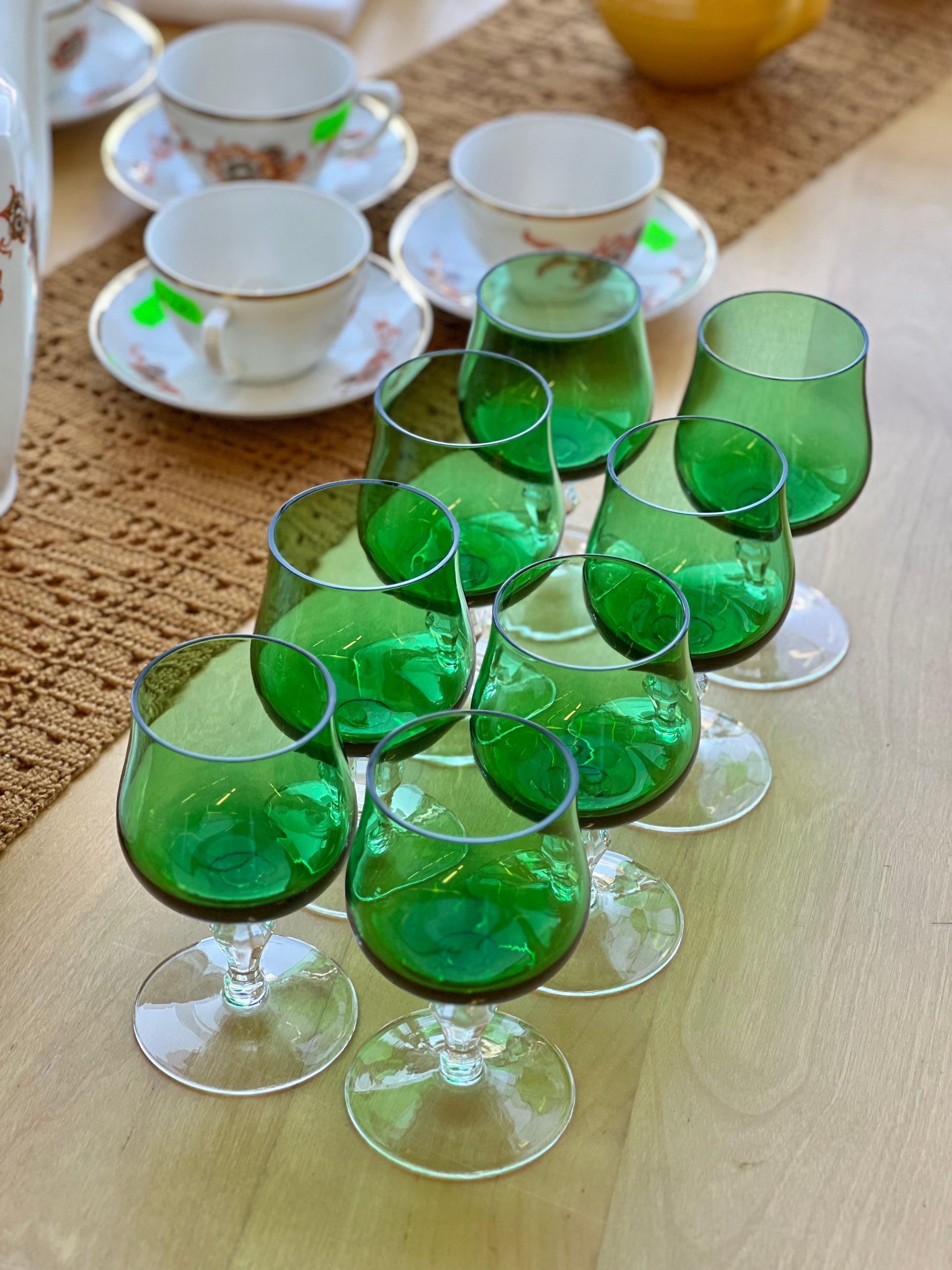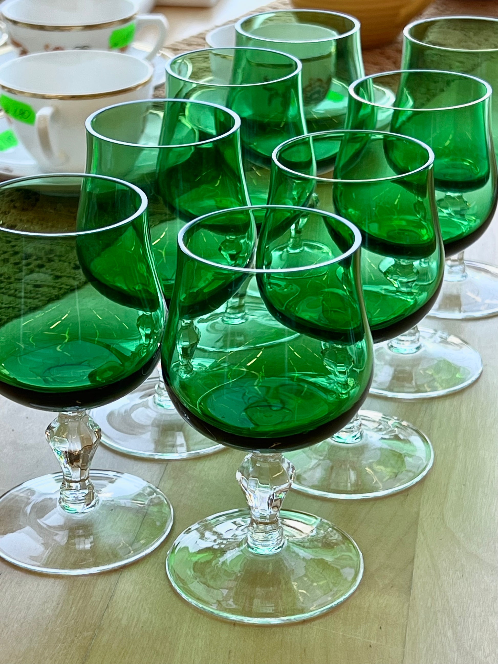 Išskirtinio dizaino stiklinės žalios splavos taurės su elegantiškomis permatomis kojelėmis – puikus pasirinkimas vestuvėms, jubiliejui ar romantiškai dovanai mylimam žmogui.